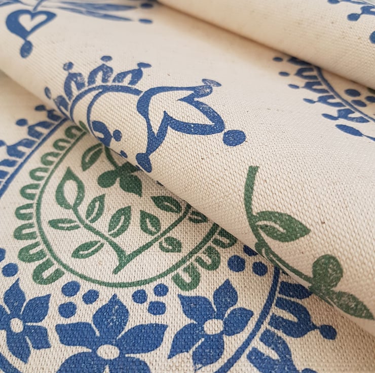 I love this fabric. It is a fairly old lino print design that I have re-visited and re-coloured. I love the way the 'block' printed feel has reproduced so well, giving the print a lovely texture.