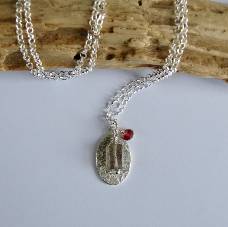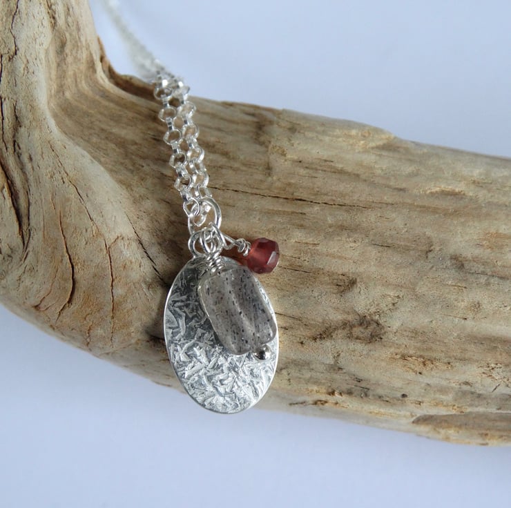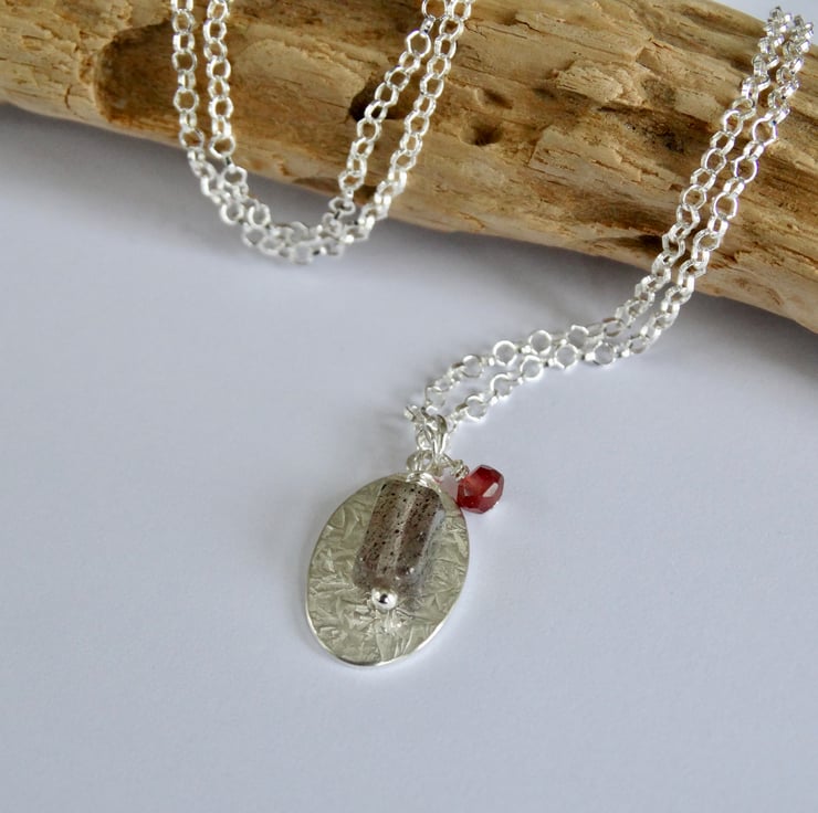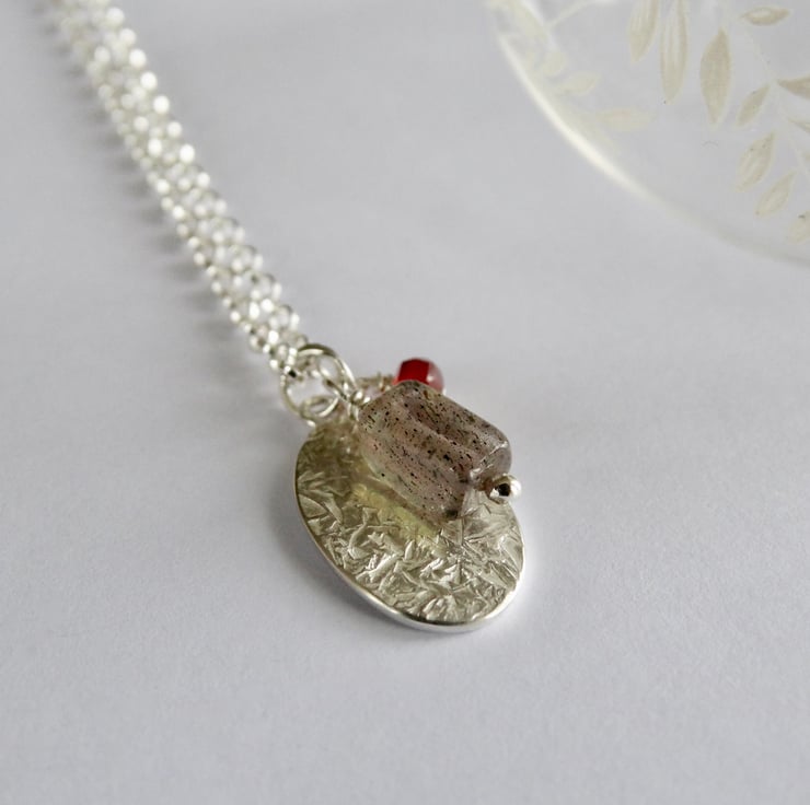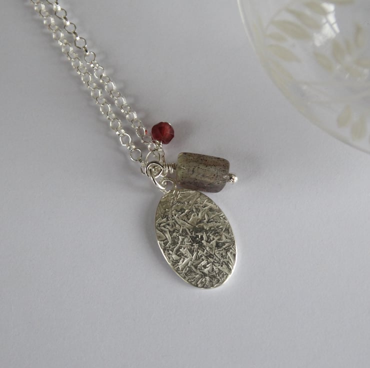 A tiny sterling silver oval pendant with a textured surface inspired by frost, embellished with a little rectangular labradorite bead and a tiny faceted garnet.