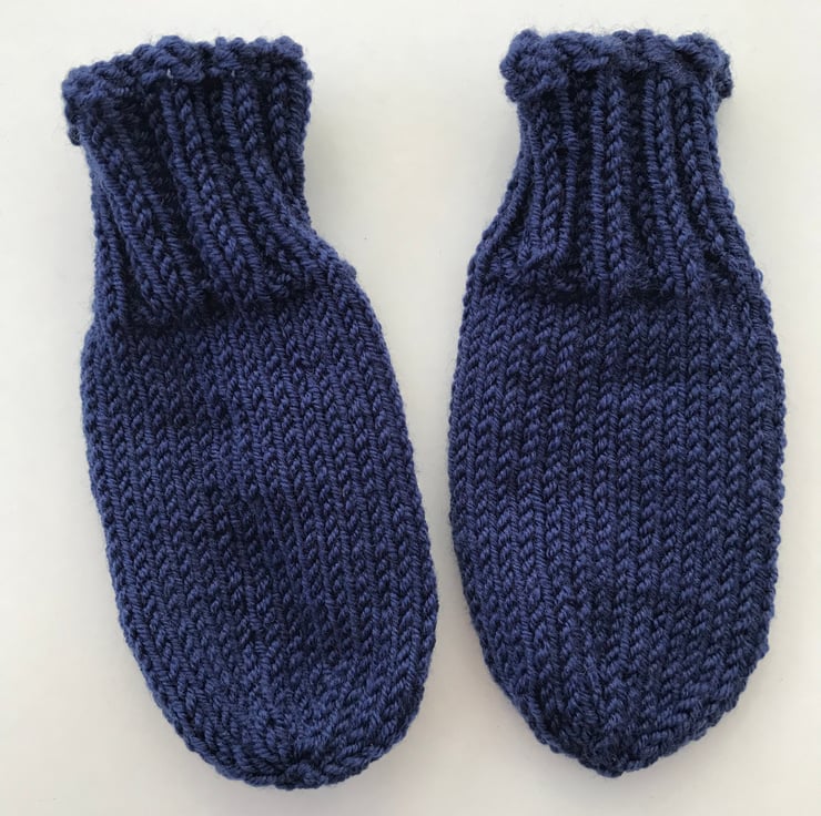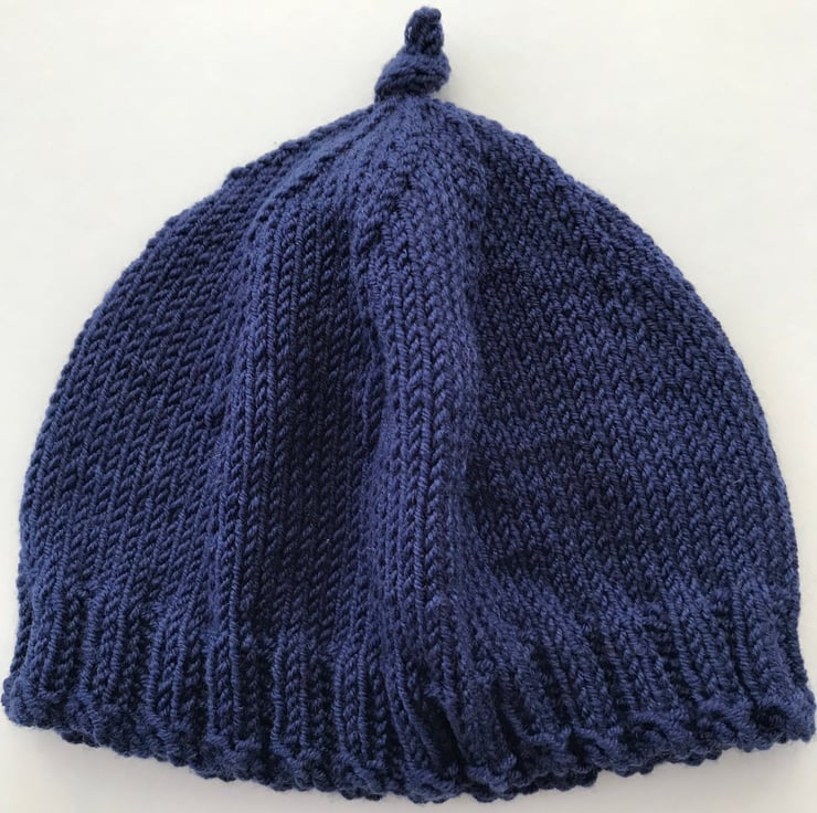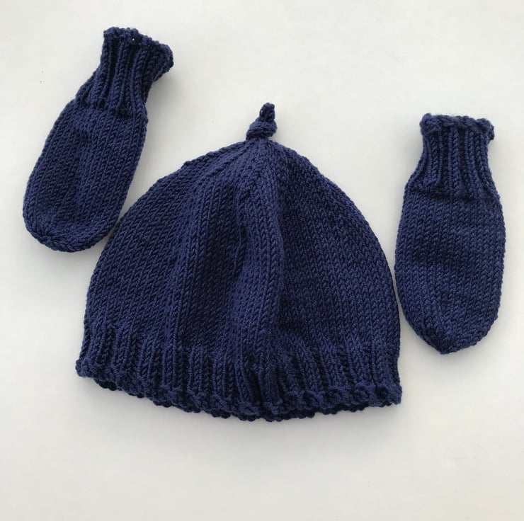 A handmade hat and mitten set knitted in a French navy Merino wool. The hat has a knotted cord at the top, giving it the look of a beret and the mittens have ribbed cuffs.