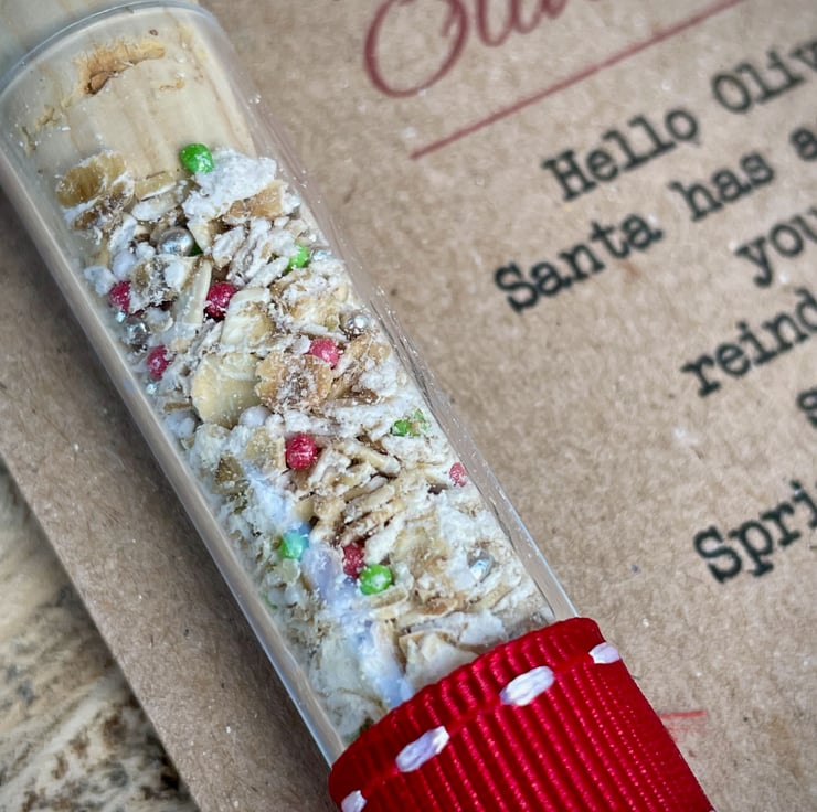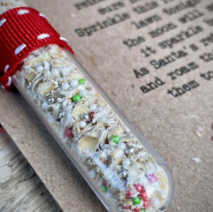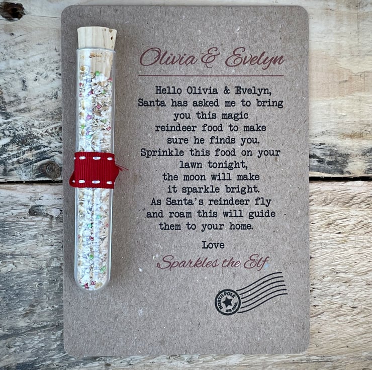 Reindeer Food supplied in a test tube with red ribbon tie attaching it to the personalised postcard.