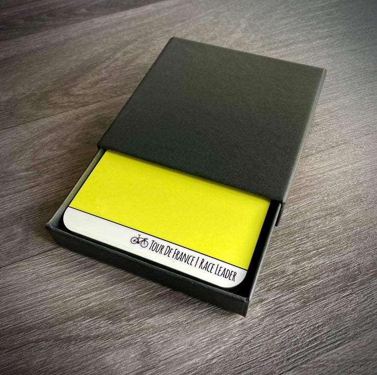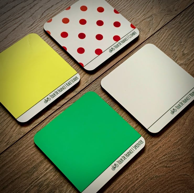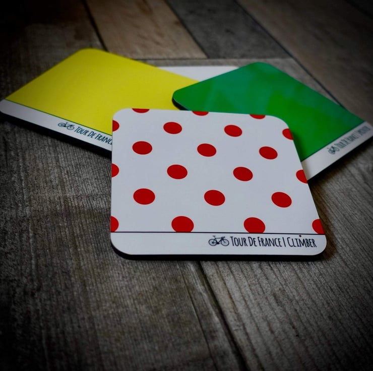 The worlds most famous cycle jersey colours have been made into this fantastic coaster set in the EllieBeanPrints studio. This cycling coaster set contains 1 of each design. Yellow (Race Leader), Green (Sprinter) Red Polka Dot (Climber) and White (Young Rider)