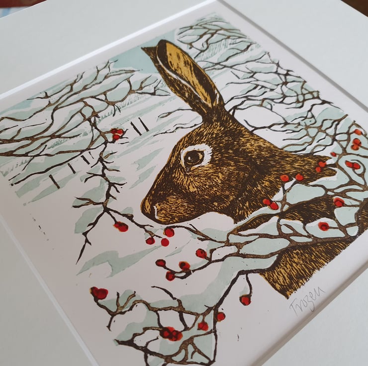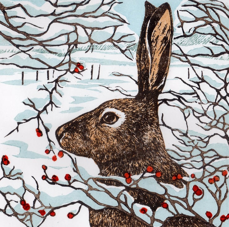 Originally designed to be an image for a Christmas card being sold by the Norfolk Wildlife Trust this year, this picture was inspired by that momentary frozen pause when a hare senses it is being watched before it disappears at speed into the undergrowth.