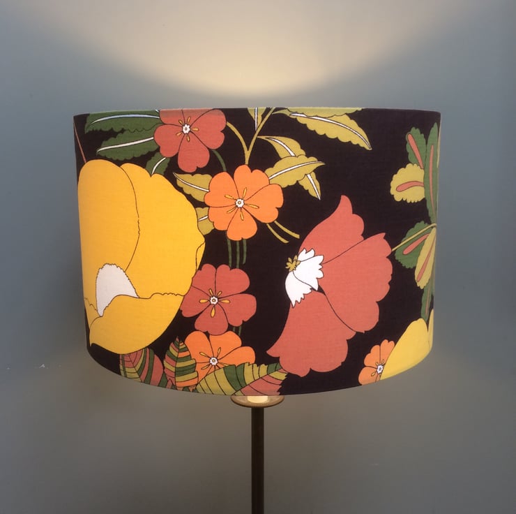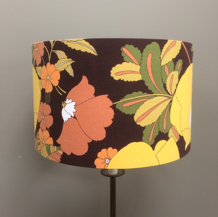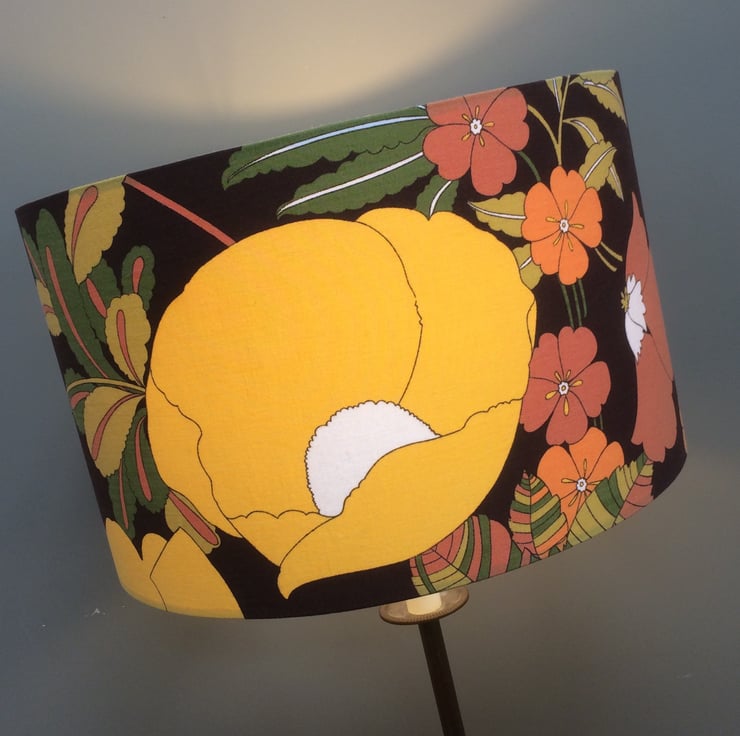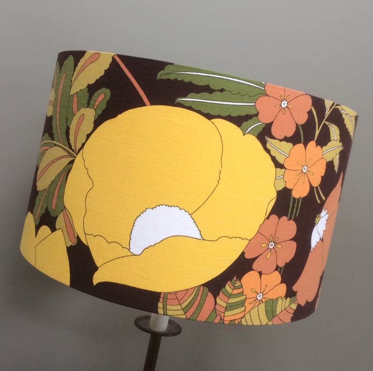 Big , Bold and Groovy Yellow Poppy, Brown Flower Power Vintage fabric Lampshade Option. Fabric is Odile by Sanderson. Designer Graham Sutherland.