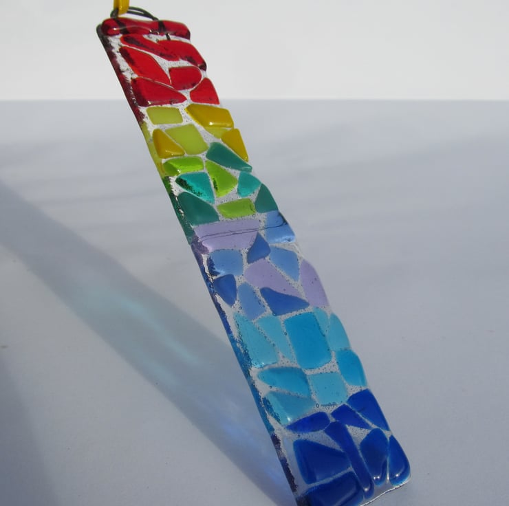 Hang them at a window, from a tree, in a conservatory or from a balcony and allow the sun to dance across the bright and vibrant colours. All of the sun catchers are ready threaded with ribbon and measure approximately 15cm long x 3cm wide.