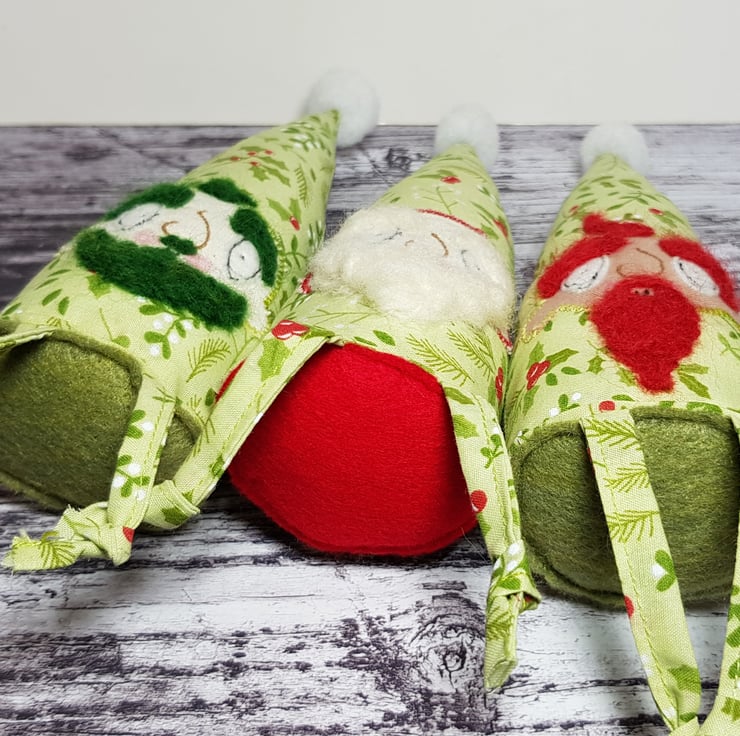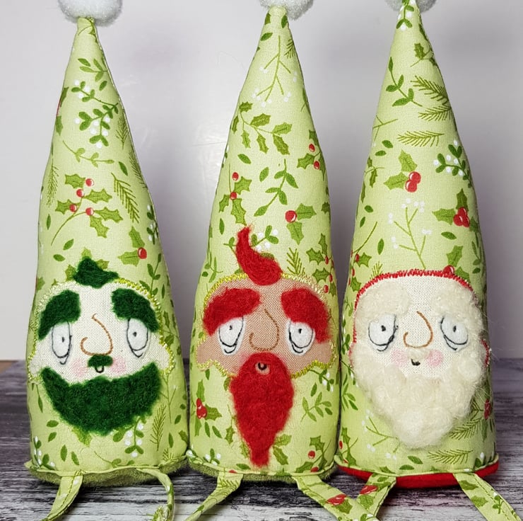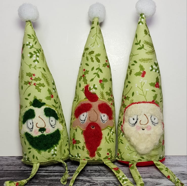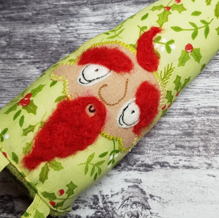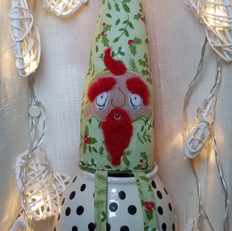 Meet Gabe, a quirky little gnome who's full of Christmas spirit. Gabe has hand dyed wool beard, needle felted into place, dangly knotted legs and waxed rosy cheeks. Gabes face is machine embroidered with felt eyes and on his back is a Wubsys felt tag. A one of a kind piece that can stand unaided topped off with a pom pom.