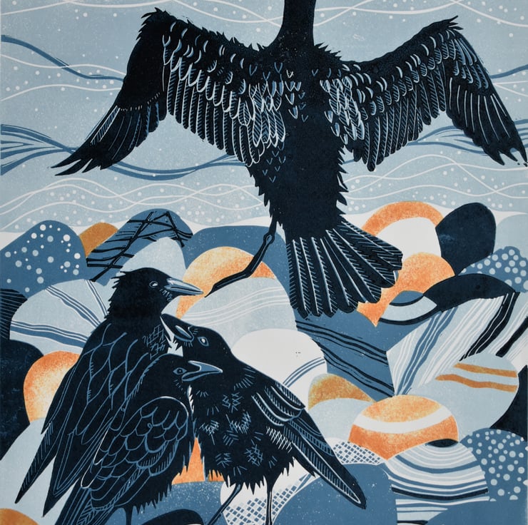 ORIGINAL lino print - 'Crows communing, cormorant drying'.