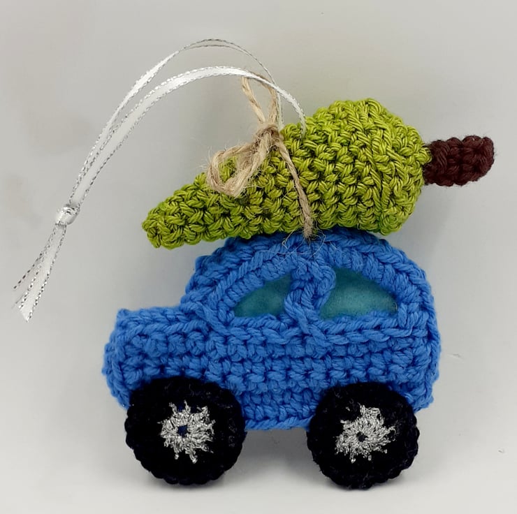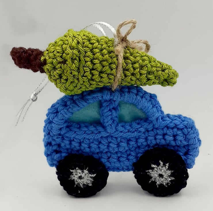 This sweet little car carrying a Christmas tree would make a great alternative to a Christmas card this year and a pretty tree decoration for many years to come. It is crocheted in cotton and metallic thread and the windows of the car are lined with felt. The tree is filled with polyester stuffing and 'tied' to the roof of the car with jute string. It comes with a tag attached bearing the words, 'Driving Home for Christmas ' or if you prefer, a tag with your own personal message. The car comes wrapped in tissue in a labelled PIP (Postage in Proportion) box all ready to be given or posted on.