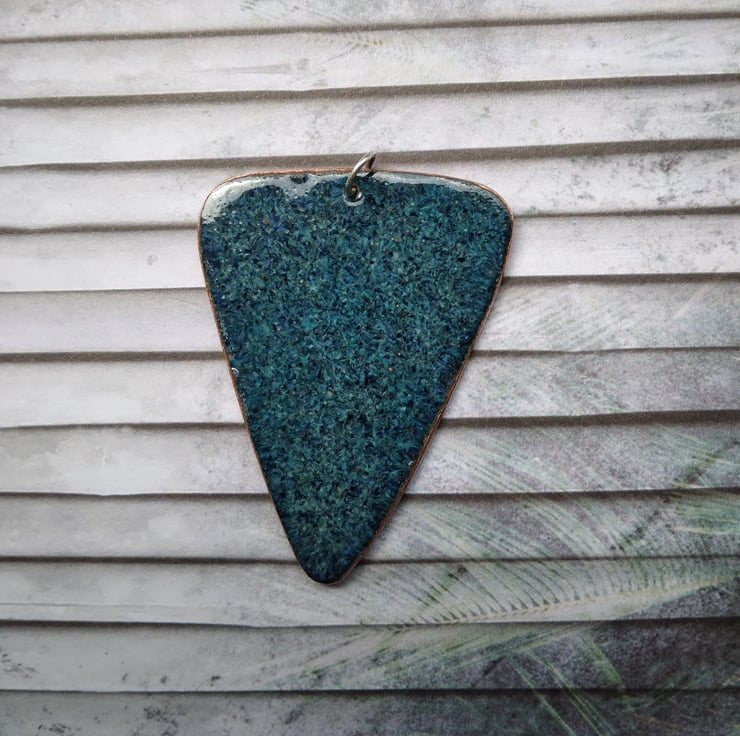 This lovely, triangular shaped pendant is made from a piece of recycled copper rescued from a life in landfill, and has been hand cut (with a lot of sanding!) to give a lovely organic shape with rounded edges. Starting with a layer of dark green, I added contrasting teal enamel which I scraped away to leave a pattern of leaf veins. The result is a bold and eye-catching design.