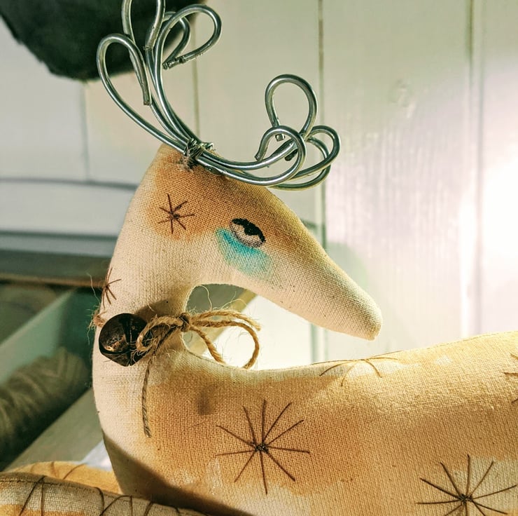 This piece is hand and machind stitched, hand stained and painted to give him an old primitive feel. He has silver metal antlers and a wool tail as well as embroidered stars and around his neck a little rusty tin bell. He has an 1930's shirt button on each leg.