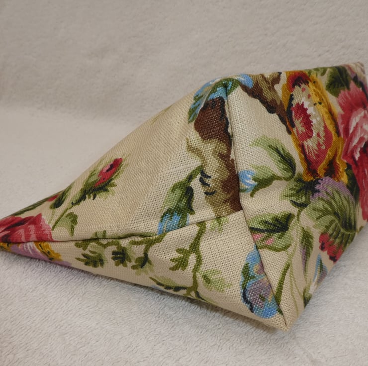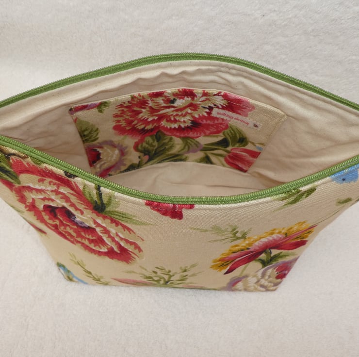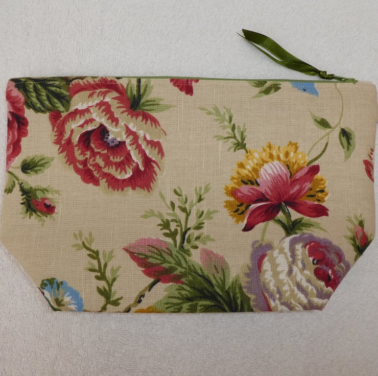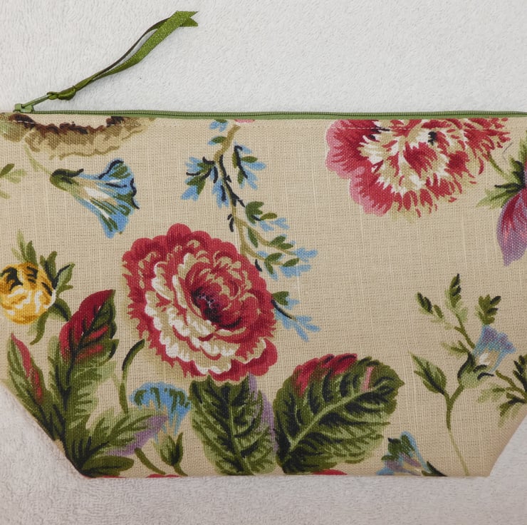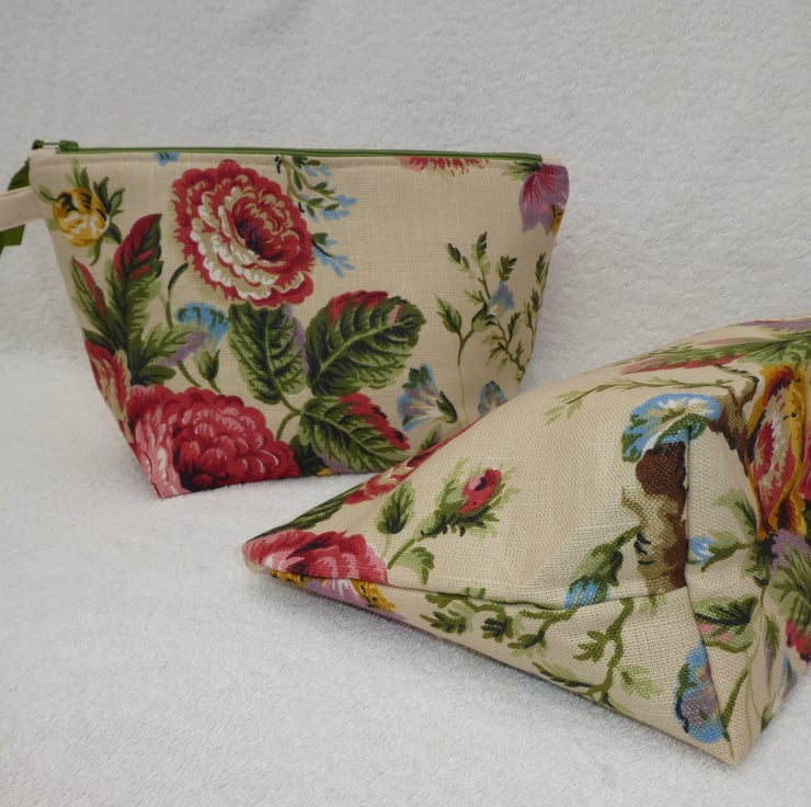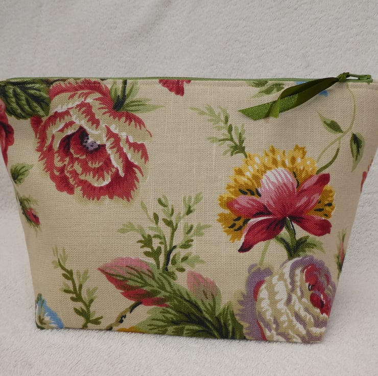 This fabulous holdall has been created from a lovely floral print 55% linen and 45% cotton blend upholstery weight fabric. It is fully lined, with wadding to give structure, and has an internal pocket. The pouch has a squared off base to make it really nice and roomy, and free-standing.