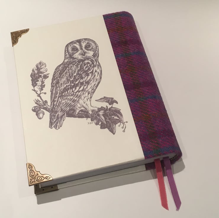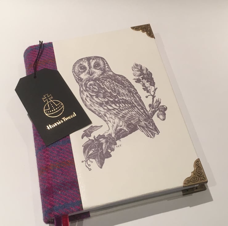 This is one of a series of A5 size journals, handmade by me at my home studio in the New Forest. All of them have a spine covered in genuine Harris Tweed, high quality either plain or printed endpapers, two velvet ribbon markers and decorative metal corners for extra protection.The front and back covers have either a stag or an owl design by illustrator Mandy Flockton. Each journal is supplied with a genuine Harris Tweed information label.