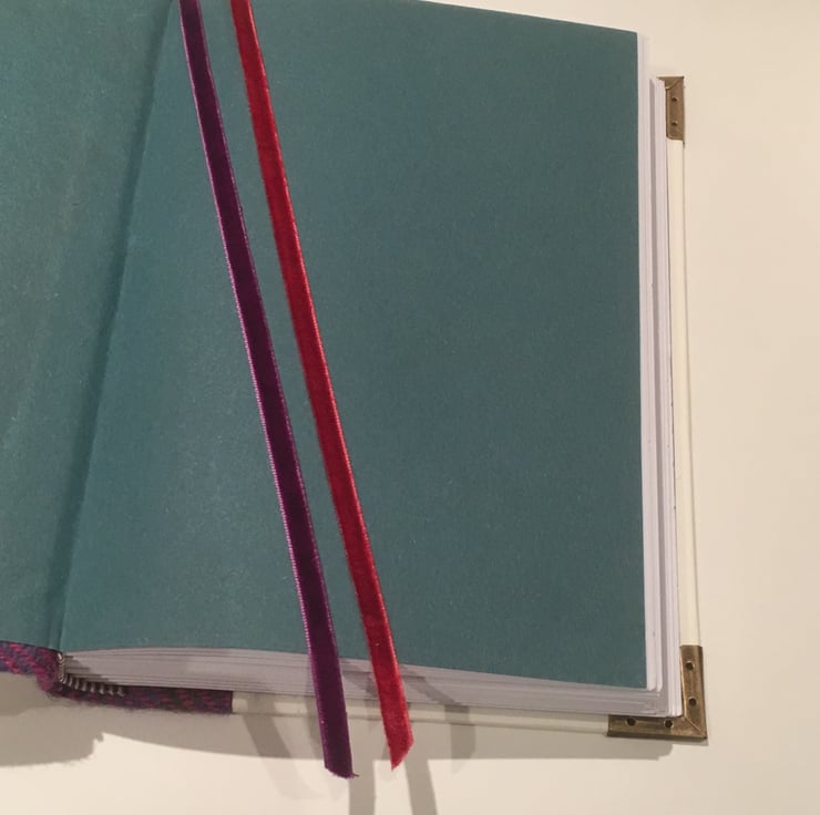 I have been binding notebooks and journals for some time and had an opportunity to progress onto making special books using luxury and high quality materials. These journals are lovely to create and I try and make each one a little bit different but all inspired by the Harris Tweed piece used to form the spine and finished with a variety of different endpapers from specialist printers or bookbinding suppliers. These are all hand stitched and bound by me at my home studio near the New Forest.
