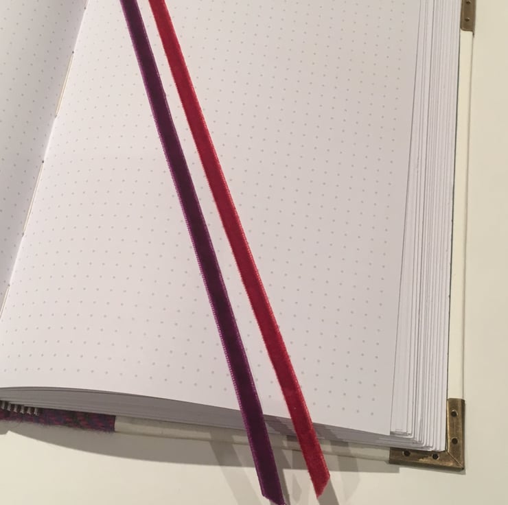 This one is called 'Pink Owl', bound with dark pink and blue Harris Tweed, 366 pages of pale grey dot print paper, suitable for fountain pen, sketching or drawing, stitched with waxed linen thread, airforce blue plain endpapers, twin dark pink and purple velvet ribbon markers, purple and white endbands, and measures 220 x 170 x 35 mm.
