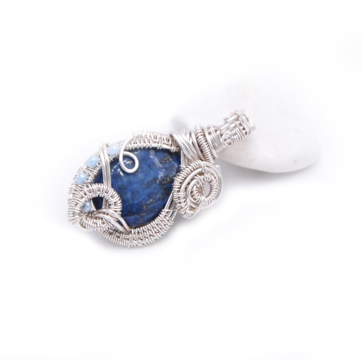 At the centre is a lapis lazuli gem stone; the wrapping is complimented by small blue beads.