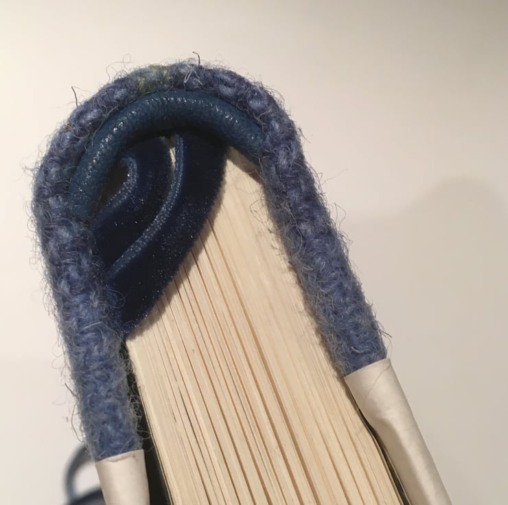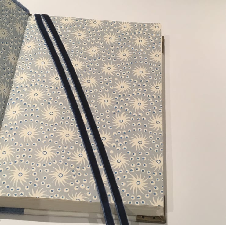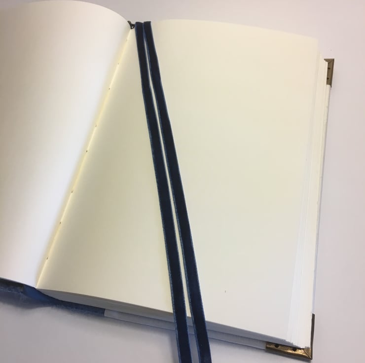 This one is called 'Blue Owl', bound with pale blue Harris Tweed, 240 pages of smooth ivory plain wood free and acid free paper (130gsm so suitable for fountain pen, sketching or drawing), stitched with waxed linen thread, pale blue 'milky way' design endpapers, dark blue velvet ribbon markers, pale blue leather endbands, and measures 220 x 165 x 30 mm.