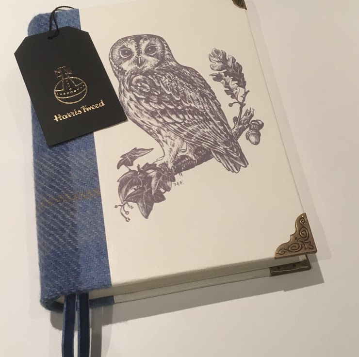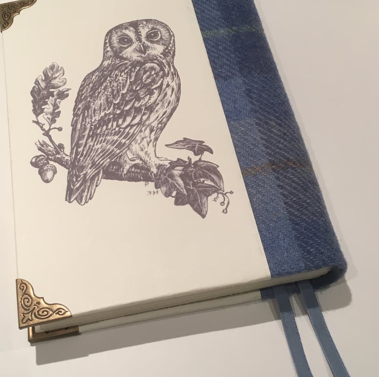 This is one of a series of A5 size journals, handmade by me at my home studio in the New Forest. All of them have a spine covered in genuine Harris Tweed, high quality either plain or printed endpapers, two velvet ribbon markers and decorative metal corners for extra protection.The front and back covers have either a stag or an owl design by illustrator Mandy Flockton. Each journal is supplied with a genuine Harris Tweed information label.