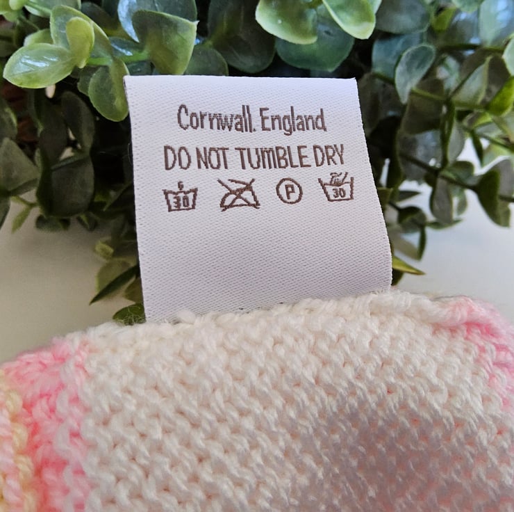 On the inside side seam the soft damask Demelza Designs garment label has the care instructions woven within it. On the outside front the branded garment swing tag is attached providing a professional finish if gifting.