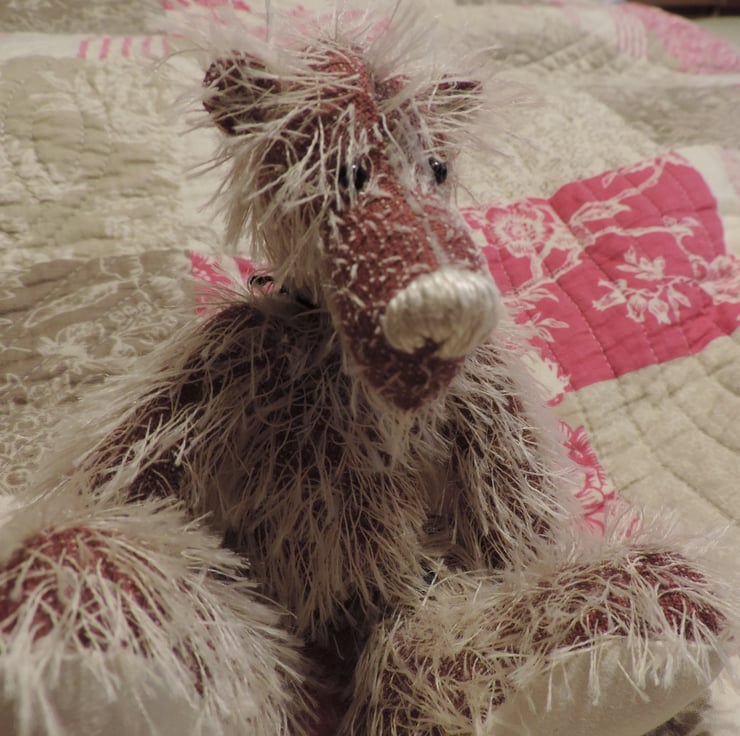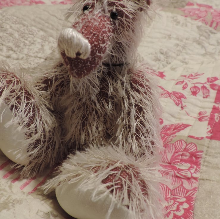 Sweet & inch tall mohair bear. Handmade from a white on pink background mohair. Fully jointe with Glass eyes and steel shot weighting