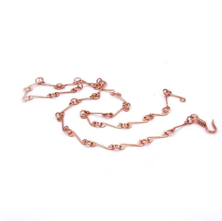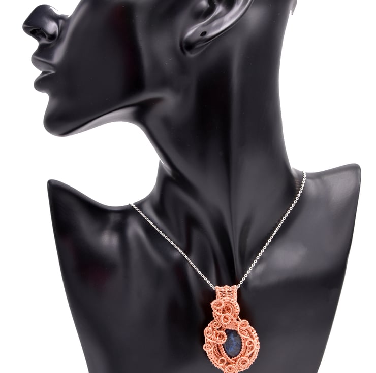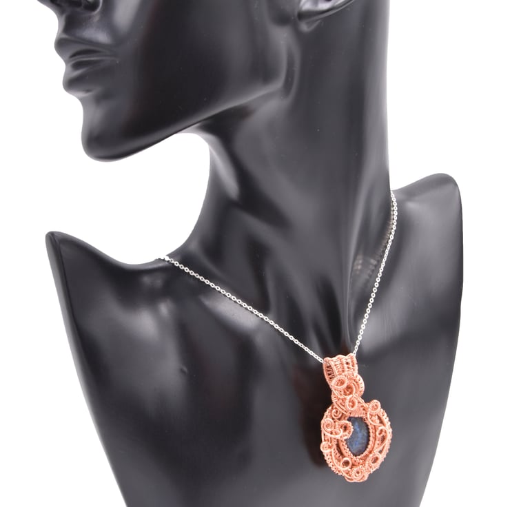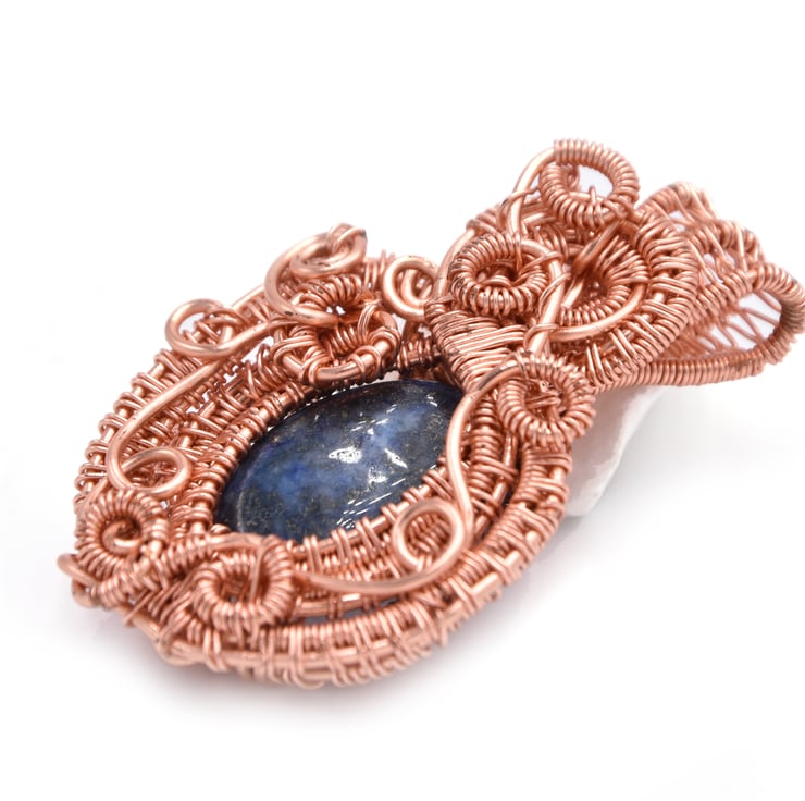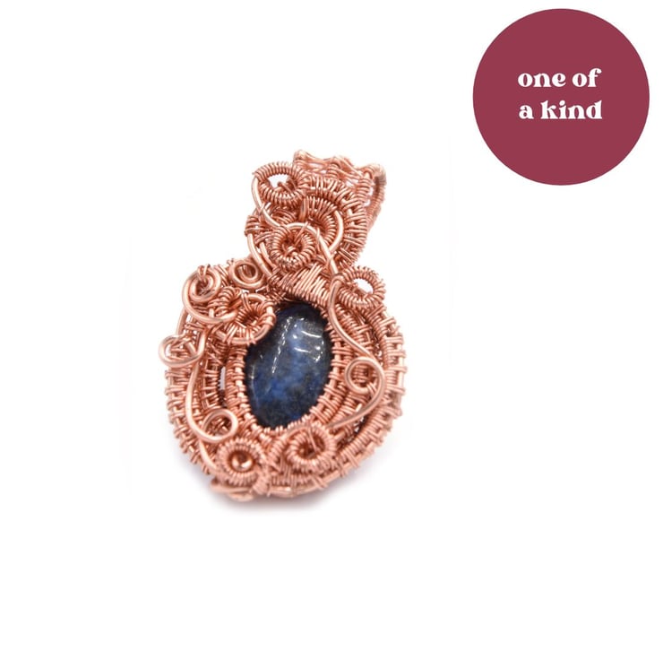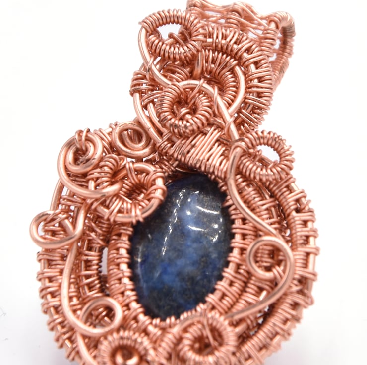 This intricate pendant is made from tarnish resistant copper wire. At the centre is a lapis lazuli gem stone.