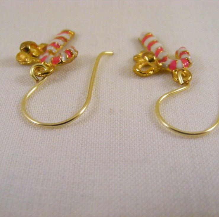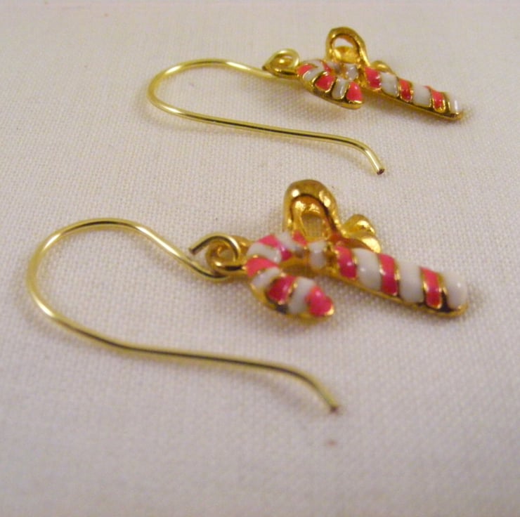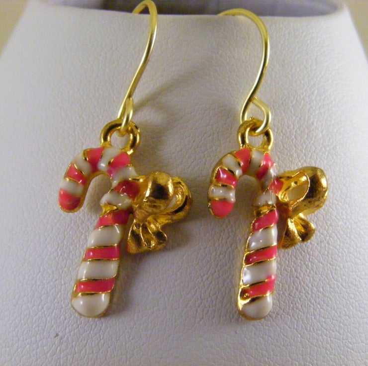 Christmas earrings are made with 22 x 14 mm gold plated metal and enamel candy cane charms and gold plated wire to make the ear wires. Wire used is non tarnish and hypo allergenic. I can exchange the ear wires for studs and butterfly backs if preferred.