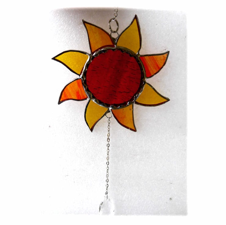 A silver coloured little chain is securely attached by solder to the top of the Sun with a little ring to hang it.
