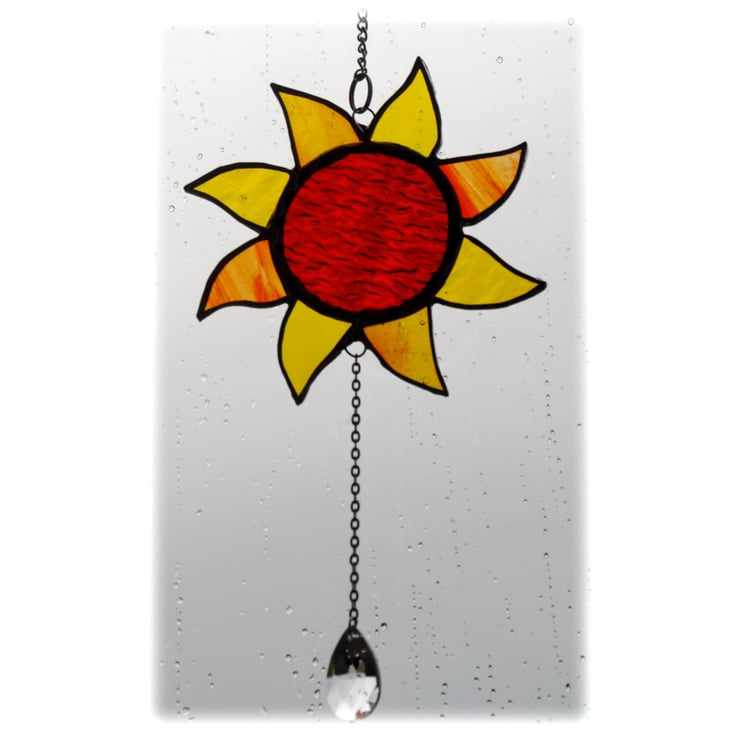 The centre of the sun is bright amber red textured glass and the rays are yellow and yellow streaked with amber.