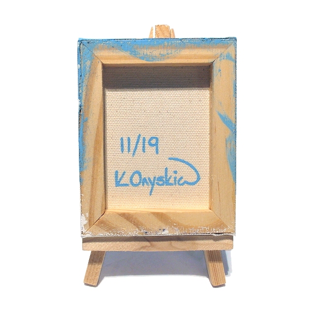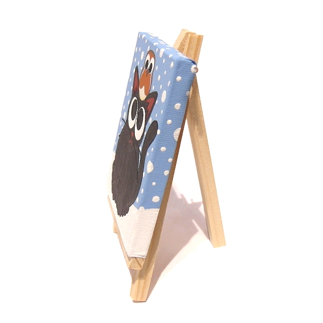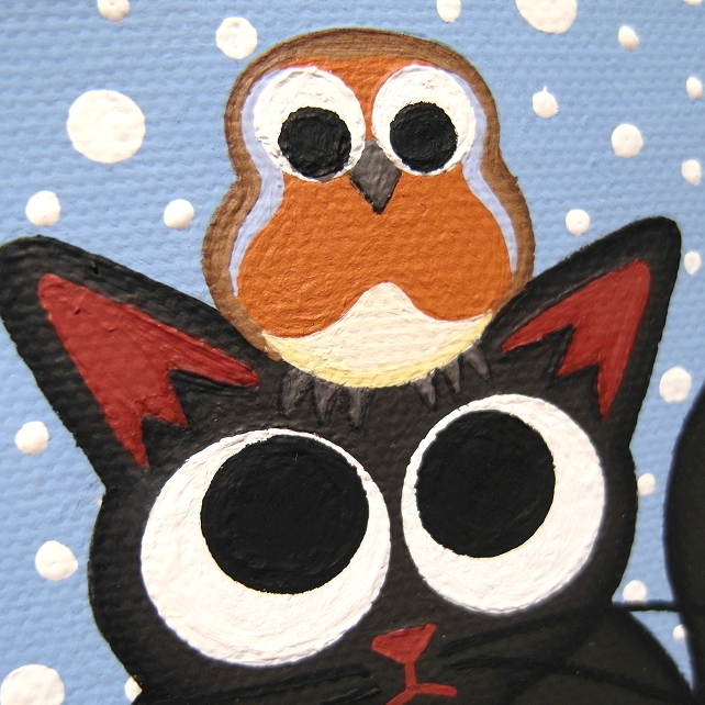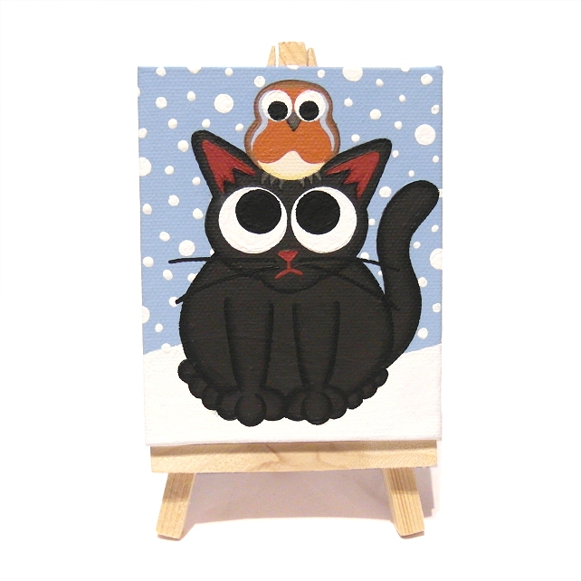 The cartoon cat and robin artwork is painted in acrylics on a mini 8cm x 10cm (3.2" x 4") canvas, and is signed and dated on the back.