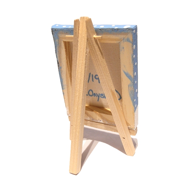 The canvas will either come with a 14cm (5.5") wooden easel for display, or will be strung with a ribbon in a colour that matches the painting so it can be hung on a wall (as in picture 9). Just choose with easel or ribbon hanging when you buy.