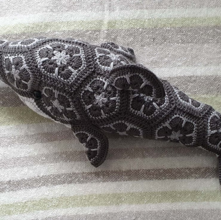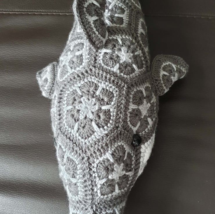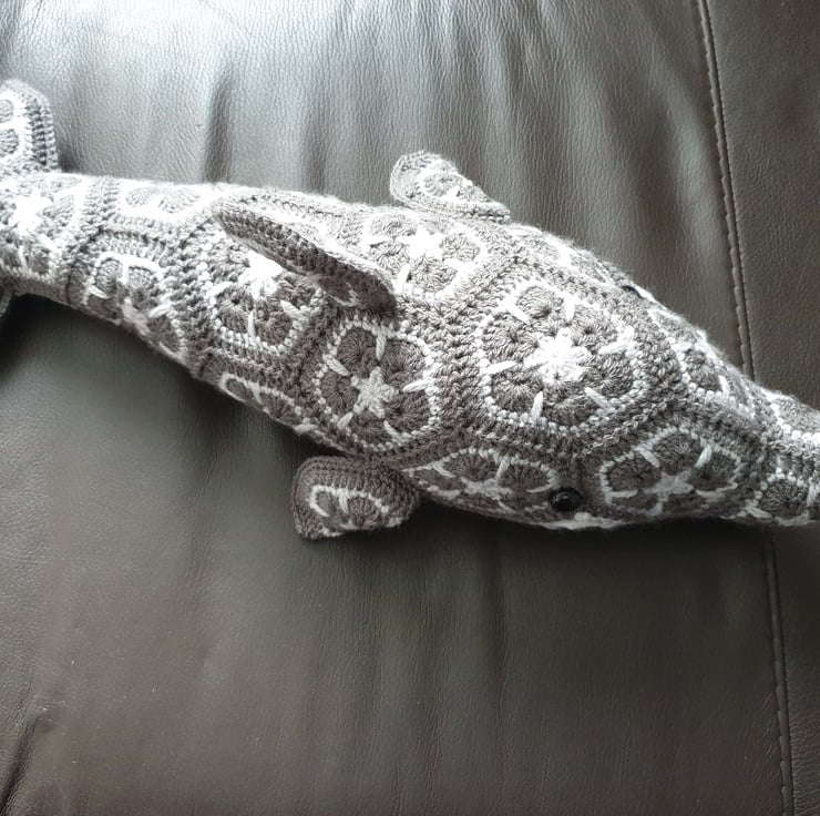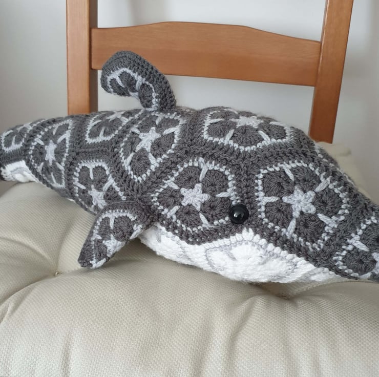 Lovely large stuffed dolphin toy, crocheted from African Flower motifs. Made from a supersoft acrylic yarn and stuffed with polyester filling and fitted with black safety eyes.