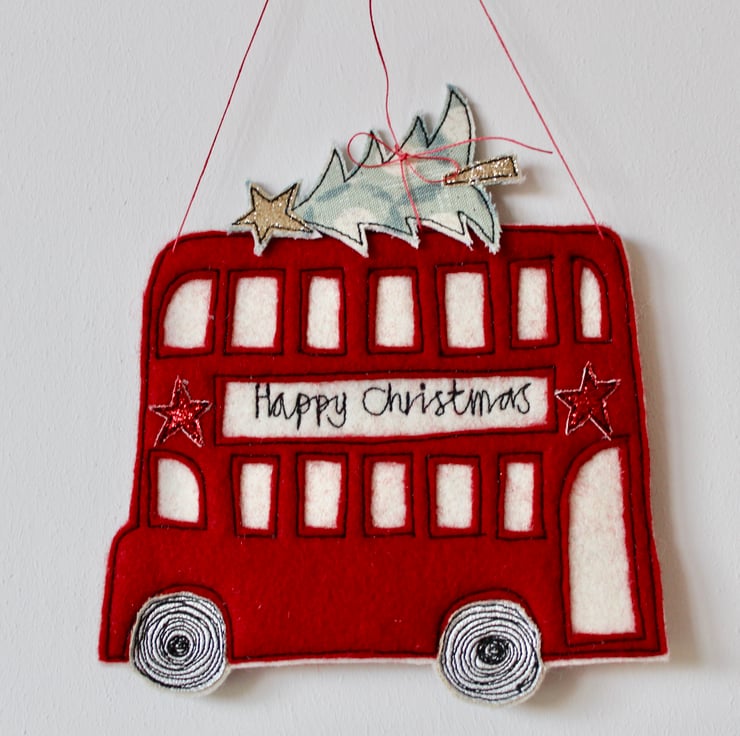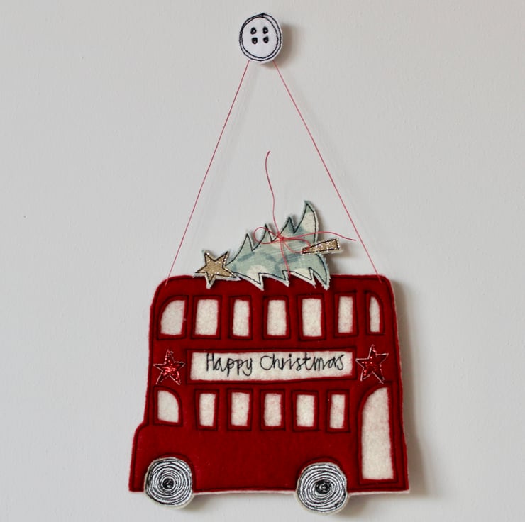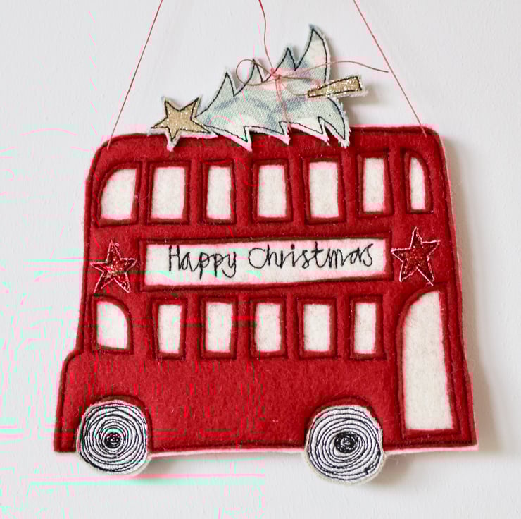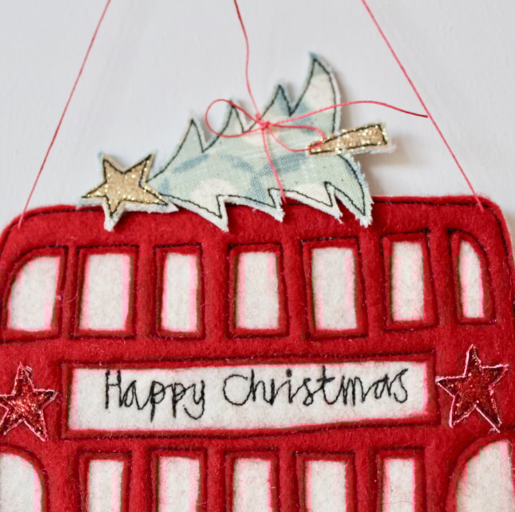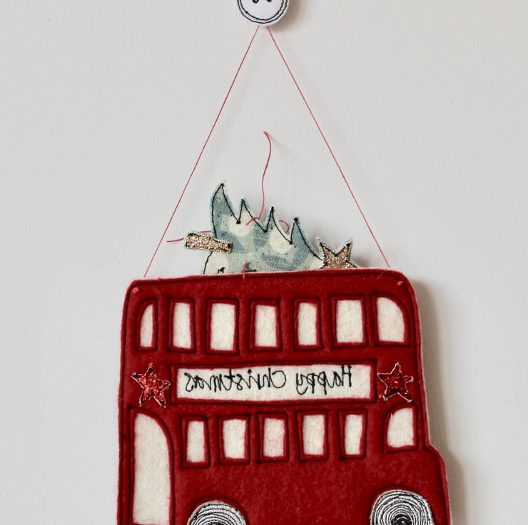 A delightful hanging decoration which is created using multiple layers of 100% wool felt, cotton cloth, glitter cloth, free hand machine embroidery and cut out by hand, using a very sharp pair of scissors.