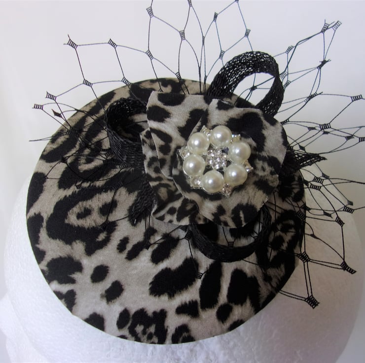 This 'Snow Leopard Print Emma' fascinator mini hat is ready made and can be shipped straight away.