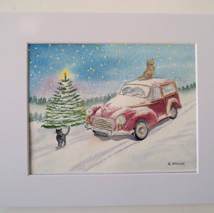 This small watercolour is entitled "Moggy Christmas. It is a winter, Christmas scene with a snowbound Morris "Moggy" Minor Traveller car, accompanied by some cats and a Christmas tree. The backdrop is a starry winter sky.