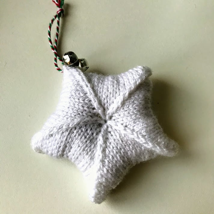 This is a lovely little 5 pointed star, knitted in white acrylic yarn and stuffed with toy grade wool stuffing which conforms to EN71, BS1425, BS5852. The star is finished with two silver coloured metal jingle bells and red, white and green baker's twine to hang.