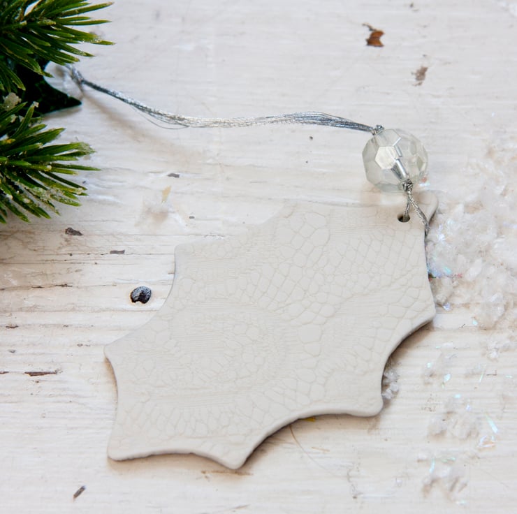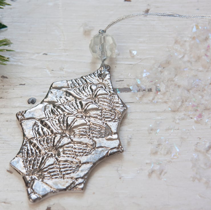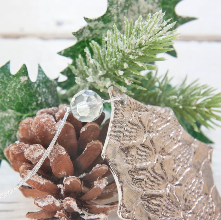 This is a fine porcelain holly leaf that has been imprinted on both sides with lace, before going through its first firing. It is then glazed, and has its second firing. Finally, each decoration is hand painted with platinum lustre to give a metallic finish and goes through a third and final firing.