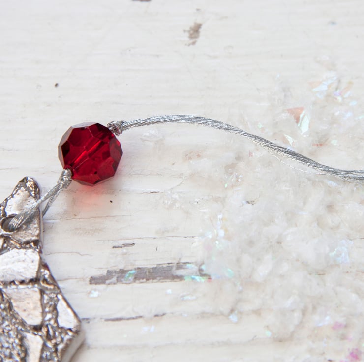 Finally, each decoration is threaded with glass beads and sparkly thread. You can choose either gold thread or green thread, so it looks like the holly branch.