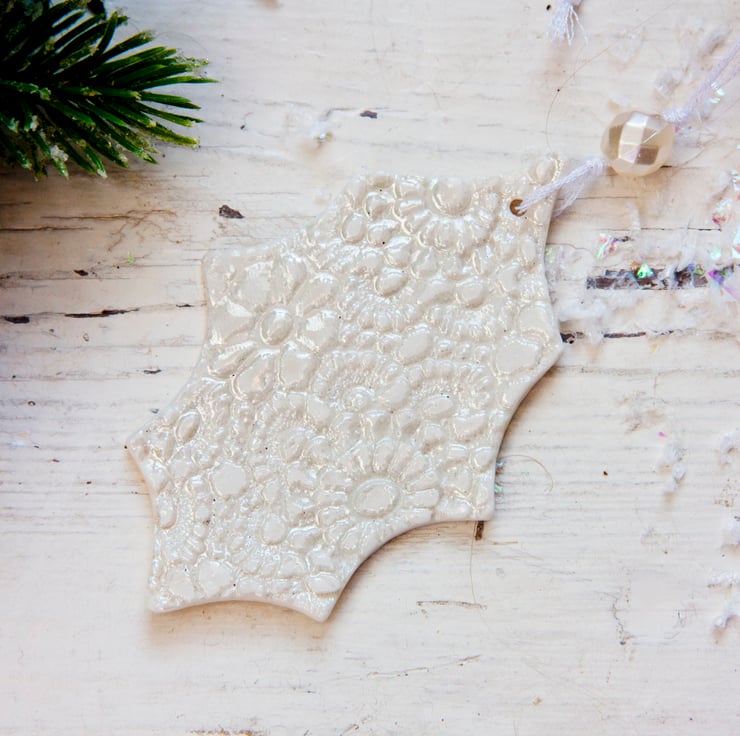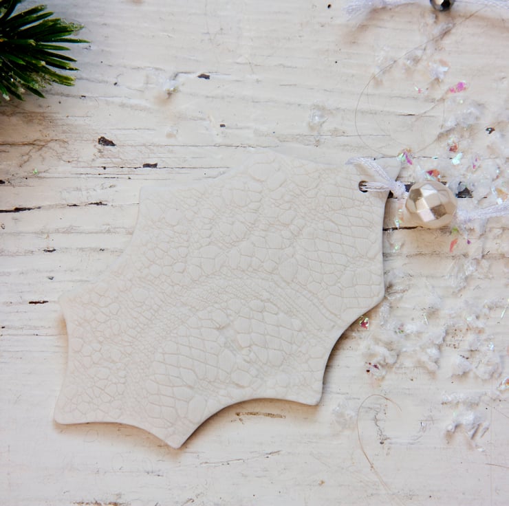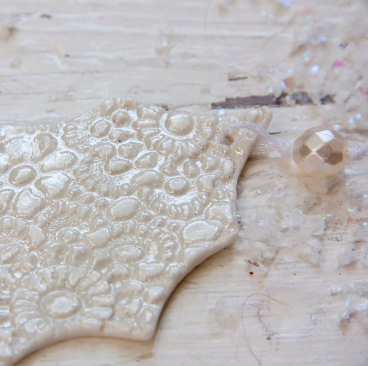 This is a fine porcelain holly leaf that has been imprinted on both sides with lace, before going through its first firing. It is then glazed, and has its second firing. Finally, each decoration is hand painted with mother of pearl lustre to give a high shine finish and goes through a third and final firing.