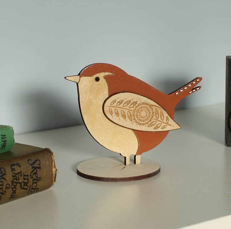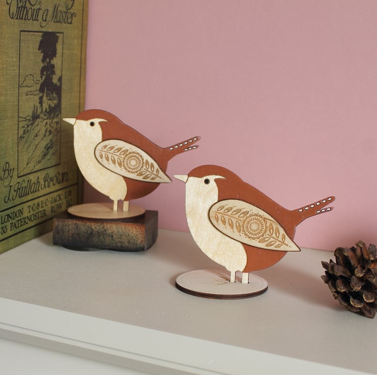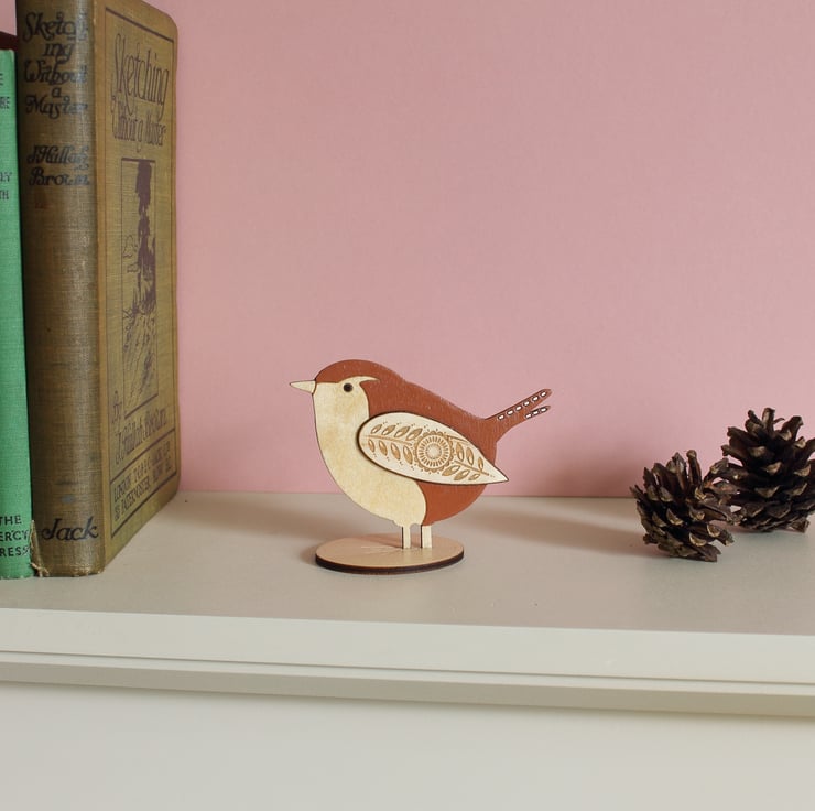 This life size standing wren is small but perfectly formed, featuring a hand painted body and intricately patterned wing. She'd look great on window sills, fireplaces, or even cheering up your desk at work.