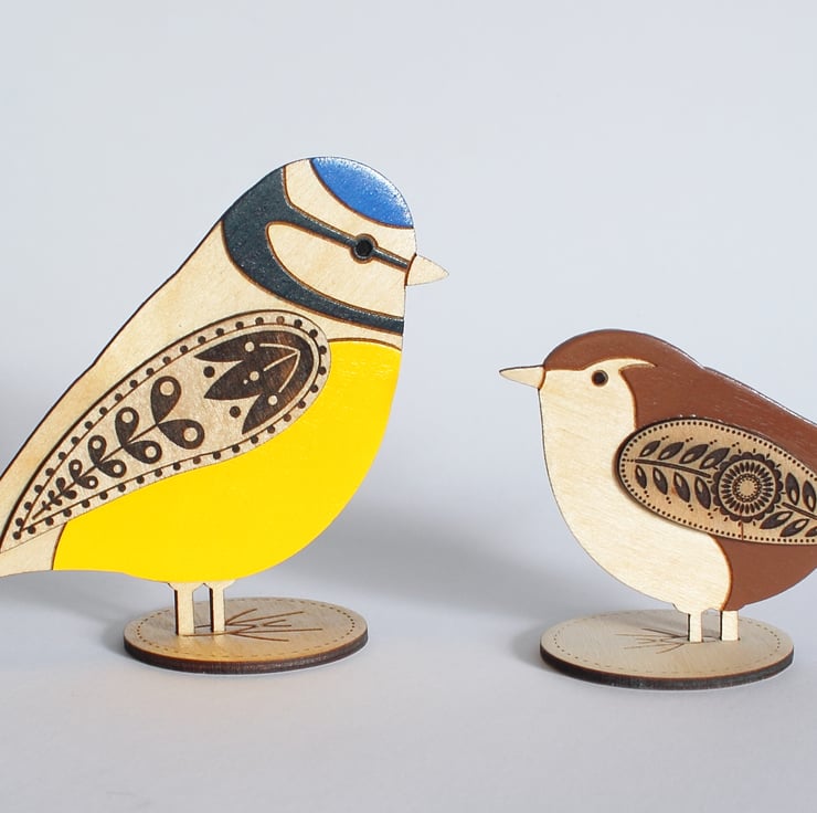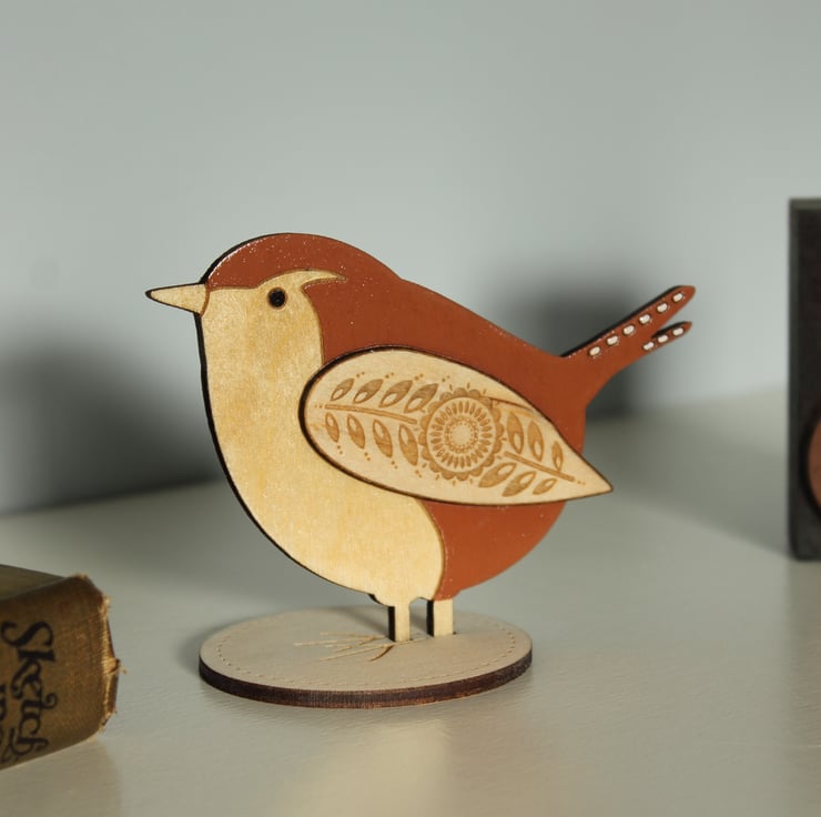 Cut from 3mm ply, she’s hand painted and features a pretty floral/leaf pattern, etched onto her wing. She’s finished with a glossy varnish to keep her lookin lovely.