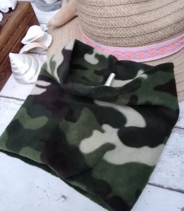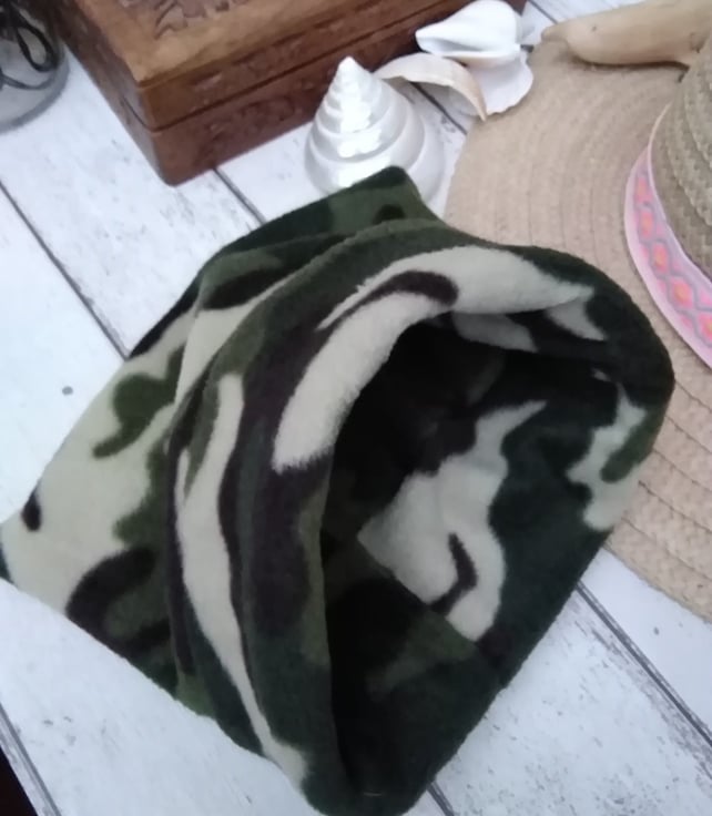 Small dog snood in a lovely cosy fleece in a green camouflage design, and it is double sided. A perfect addition to your dogs winter wardrobe. Suitable for small neck.