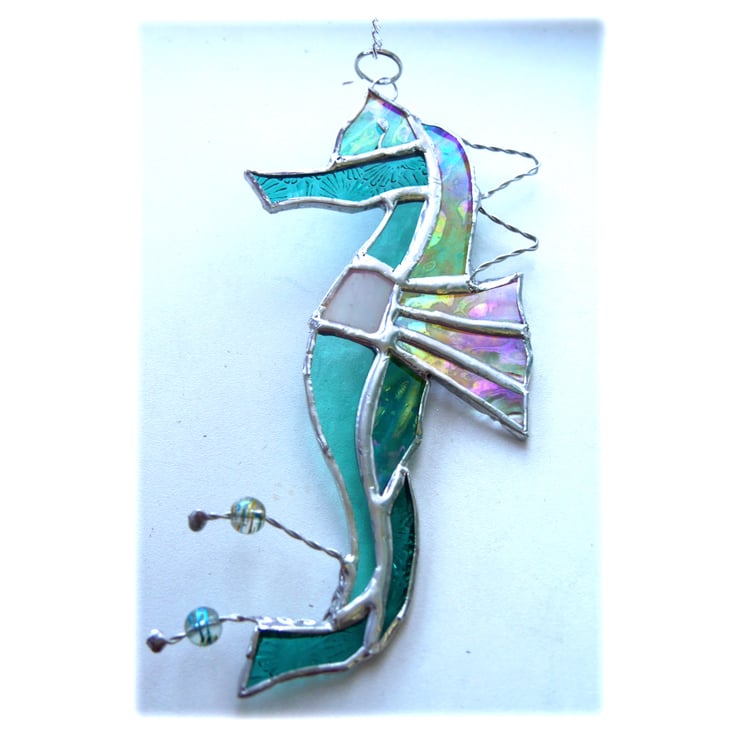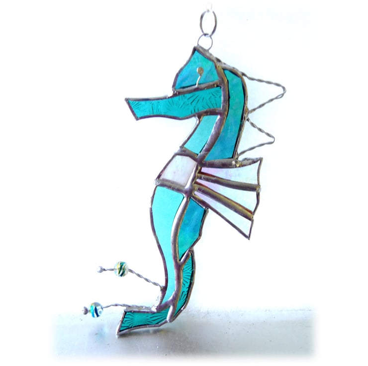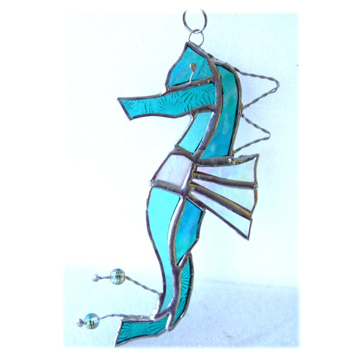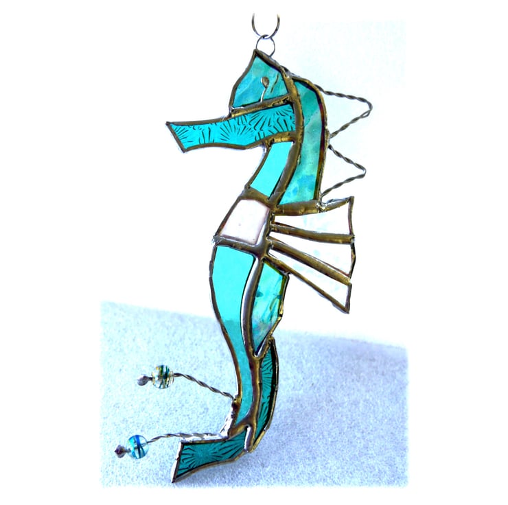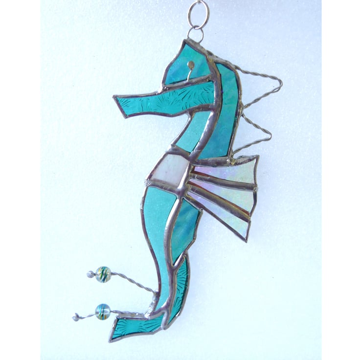 A seahorse in lovely shades of aquamarine, teal glass with a little bit of white for interest.