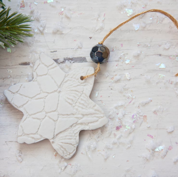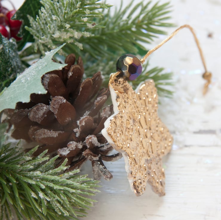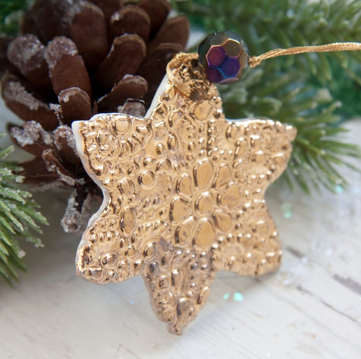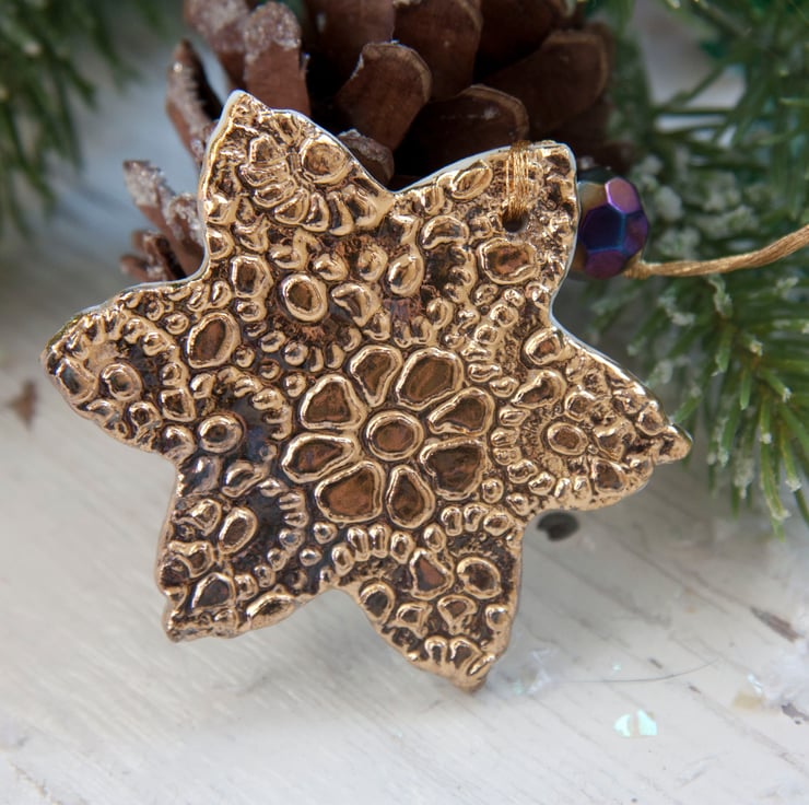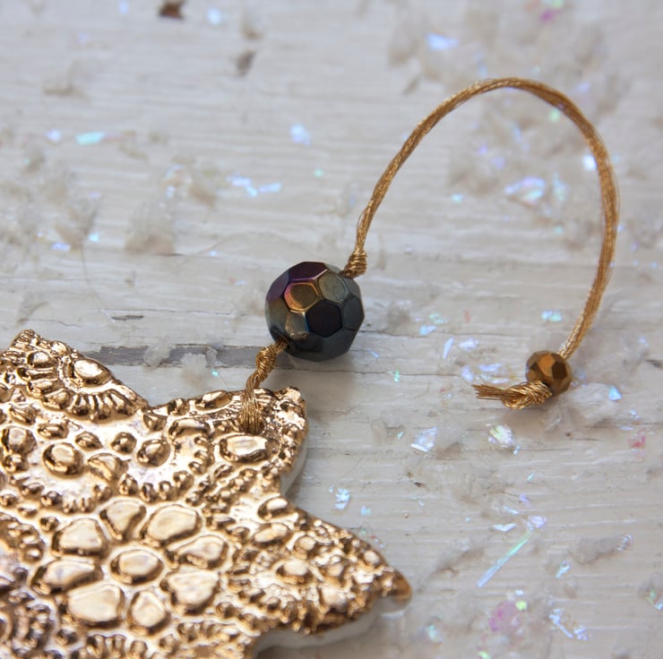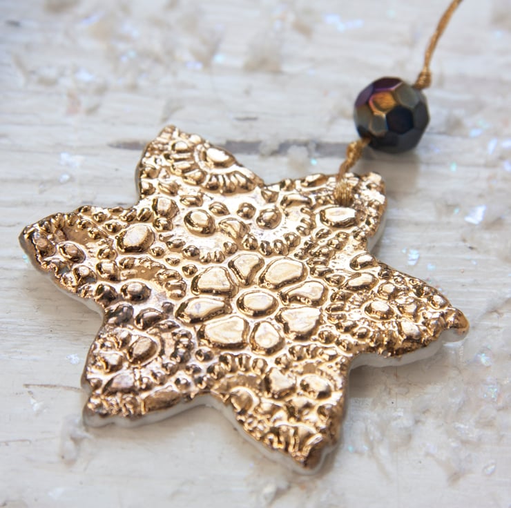 This is a fine porcelain snowflake that has been imprinted on both sides with lace, before going through its first firing. It is then glazed, and has its second firing. Finally, each decoration is hand painted with 22ct gold lustre to give a high shine finish and goes through a third and final firing.