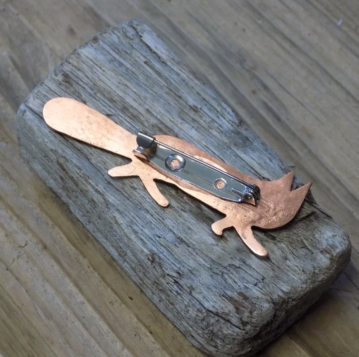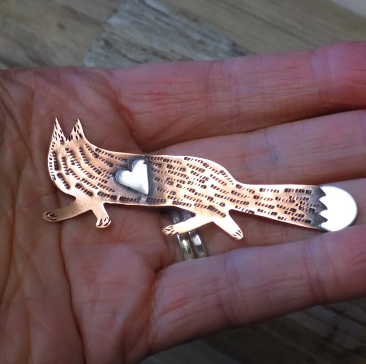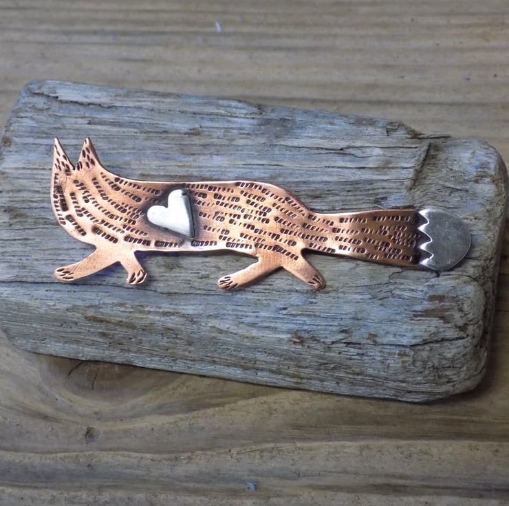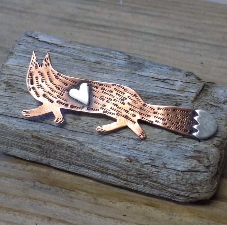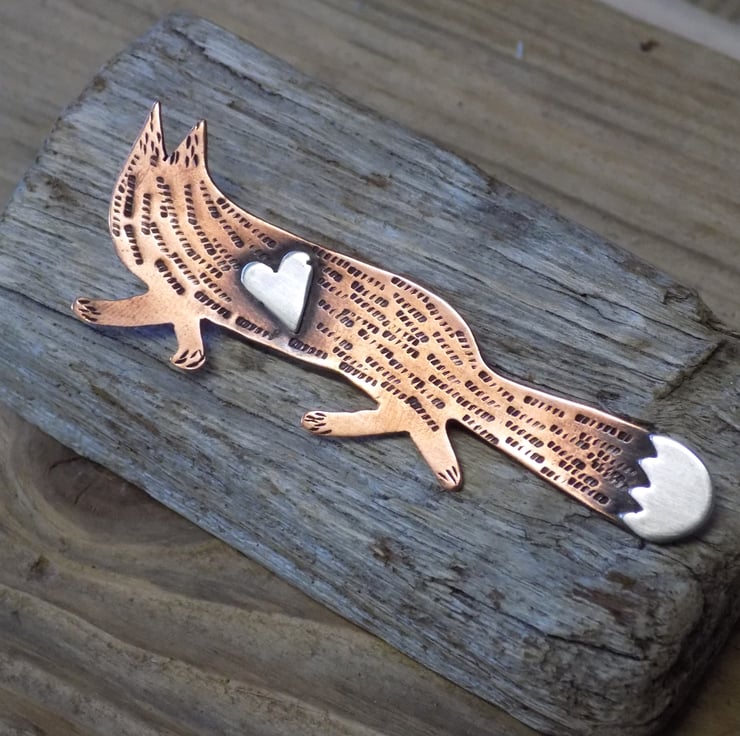 Designed and hand sawn from 1mm thick copper sheet. Each textured stroke has been stamped onto the copper to create the foxes coat and a sterling silver heart has been soldered to the front plus the 'white' tip of the foxes tail. The whole pendant has been given an aged effect which picks out all the detail and texture creating a lovely contrast between the silver and copper. A sturdy brooch setting has been fixed to the back with very strong jewellers glue.