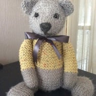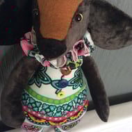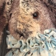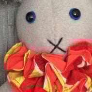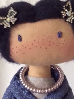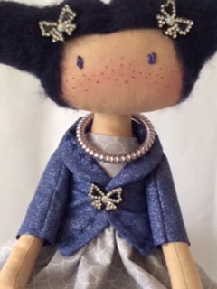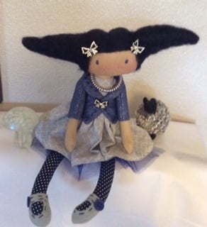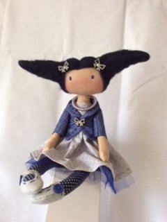 Pixie just cannot wait to meet her new best friend. She is a very pretty rag doll and measures approximately 37cm (14 1/2 ”). Her body is tea dyed cotton with various man-made and natural materials for her clothes. She is such a little cutie with her fabulous hair style made from merino needle-felted wool with pretty sparkly bows that match the bow on her lovely sparkly blue jacket. She has blue embroidered eyes and lots of freckles and a lovely bead necklace. Pretty pale blue Felt shoes over navy & white polka dot tights with navy blue buttons. Her dress is pale blue cotton with a navy blue net underskirt and for modesty she is wearing filly lace nicks.