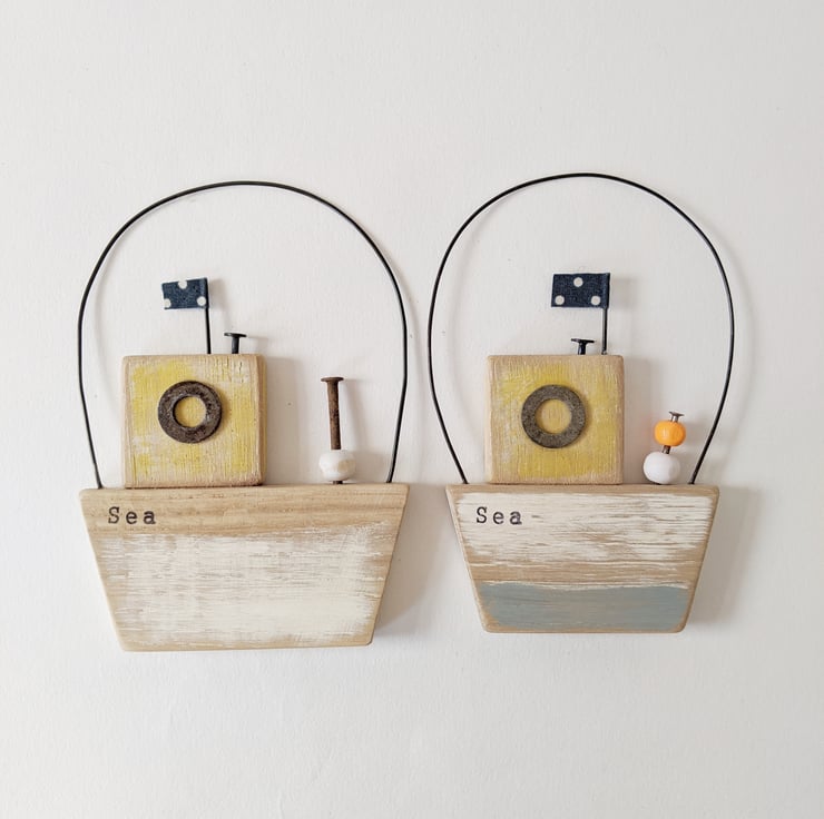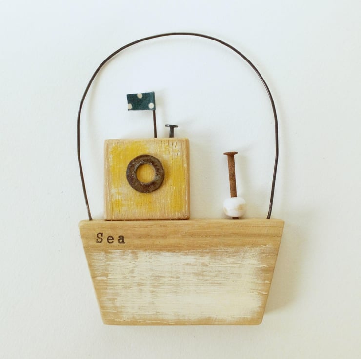 Made from hand painted wood with an old washer for a window, a flag and beads add to the seaside feel of this little hand crafted boat.