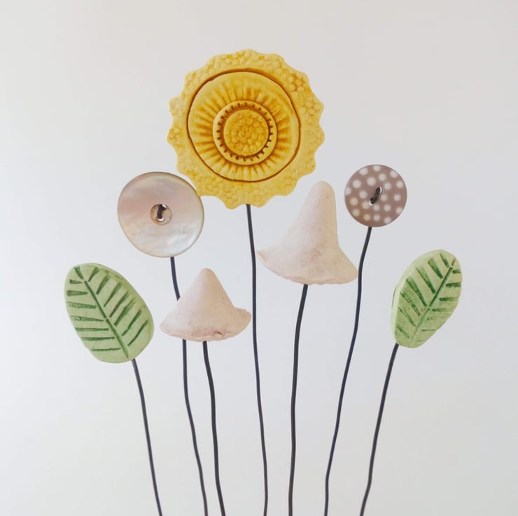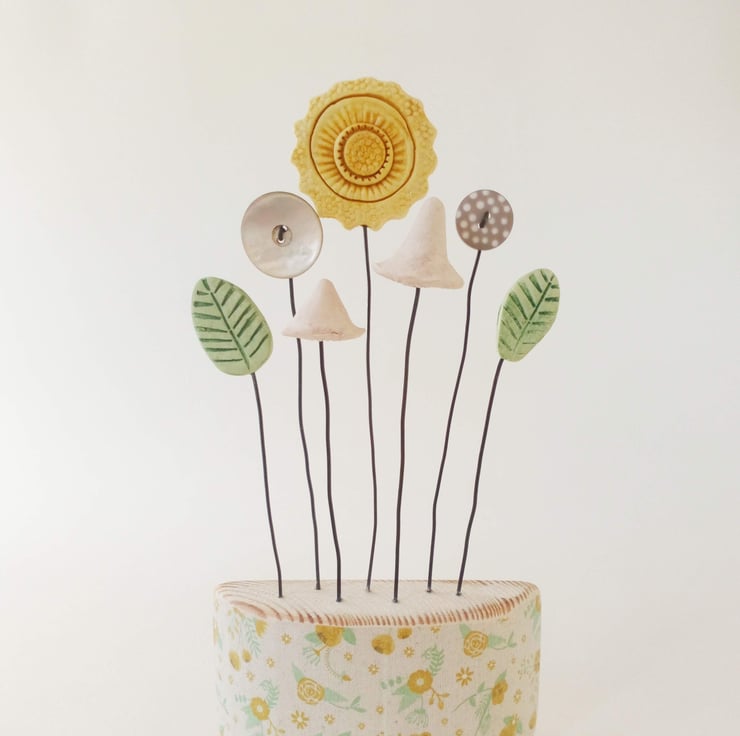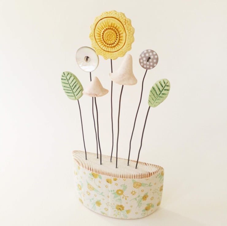 Button and clay flowers grow in this flower garden, standing on their wire stalks in a curved and decoupaged wood block.