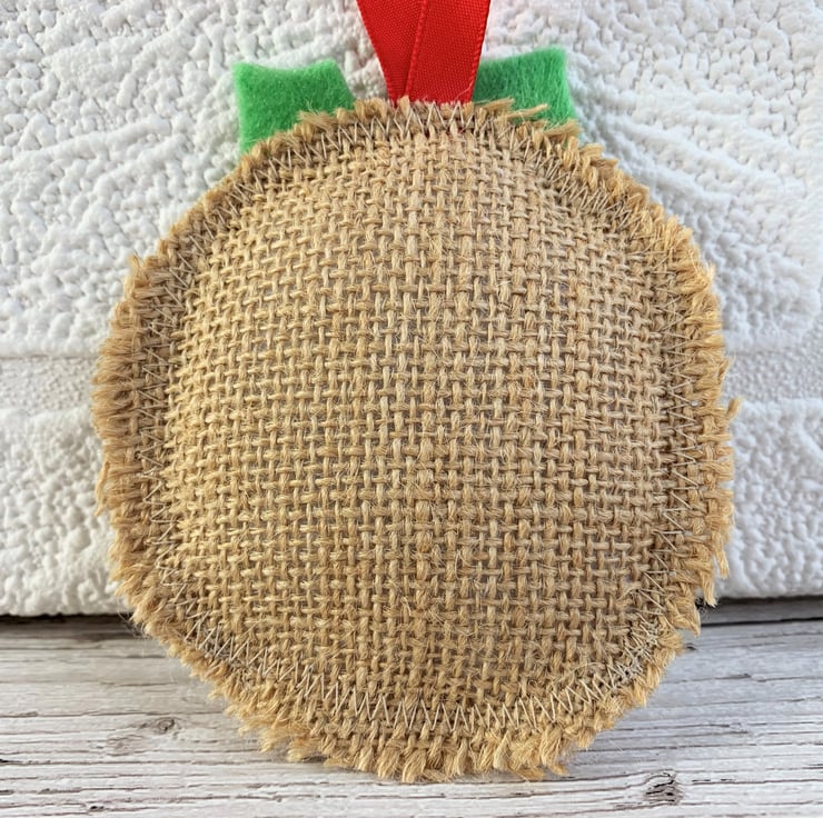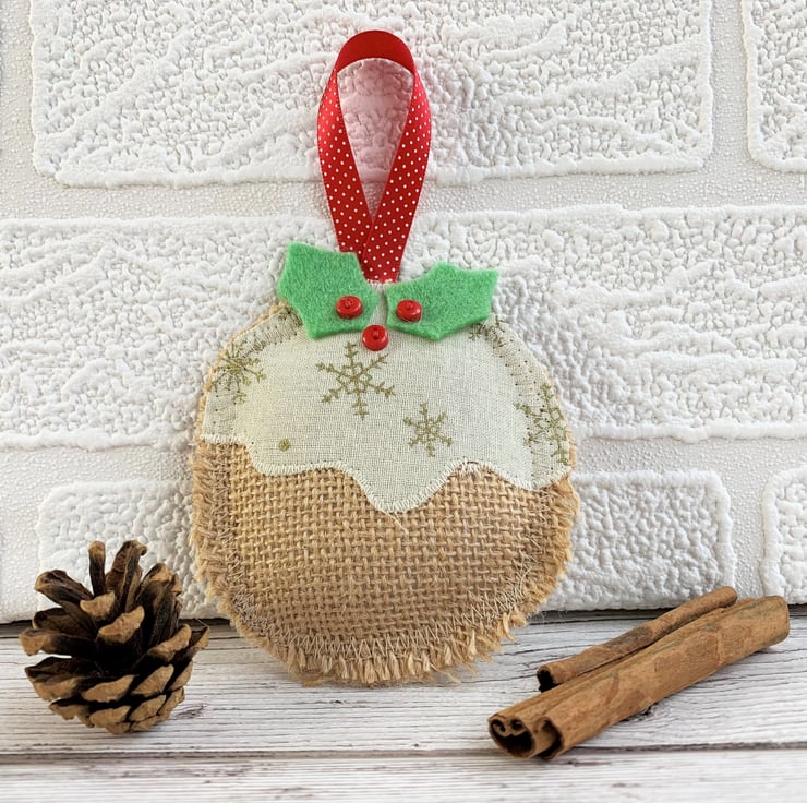 A delightful Christmas pudding rustic hanging Christmas decoration. This lovely Christmas decoration is the last one from my previous Rustic Christmas range and is reduced to clear. The Christmas pudding is made from hessian with a topping made from cream fabric with a pattern of gold snowflakes. I've added two holly leaves, which I've hand cut from green felt, and three tiny red buttons as holly berries. The Christmas decoration has a red hanging ribbon with white polka dots. The decoration is lightly padded and is filled with polyester hollow fibre filling which conforms to safety regulations.