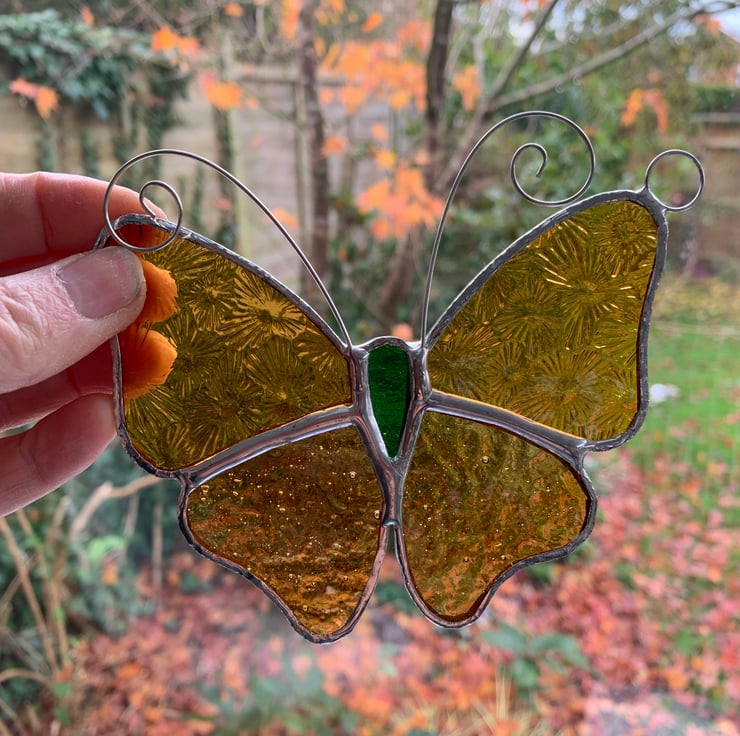 This stained glass butterfly has been made from amber streaky glass and amber florentine glass for the wings and green textured glass for the body.