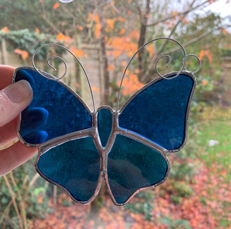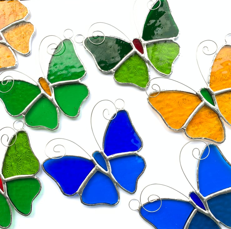The butterfly measures 11 cms across by 9 cms excluding antenna. This would be lovely hanging in any window or even on a mirror, and they look especially good if hung in pairs or more. Did you know the collective noun for a group of butterflies is a kaleidoscope?