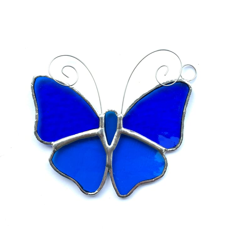 This stained glass butterfly has been made from bright blue corella glass and bright blue wissmach glass for the wings and turquoise sea glass for the body.
