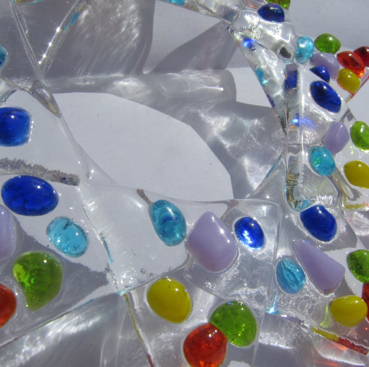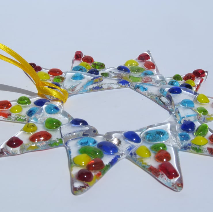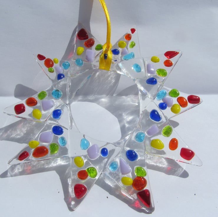 This bright and vibrant hand made fused glass star makes a fantastic gift for anyone who likes stars, bright colours and ornamental glass.